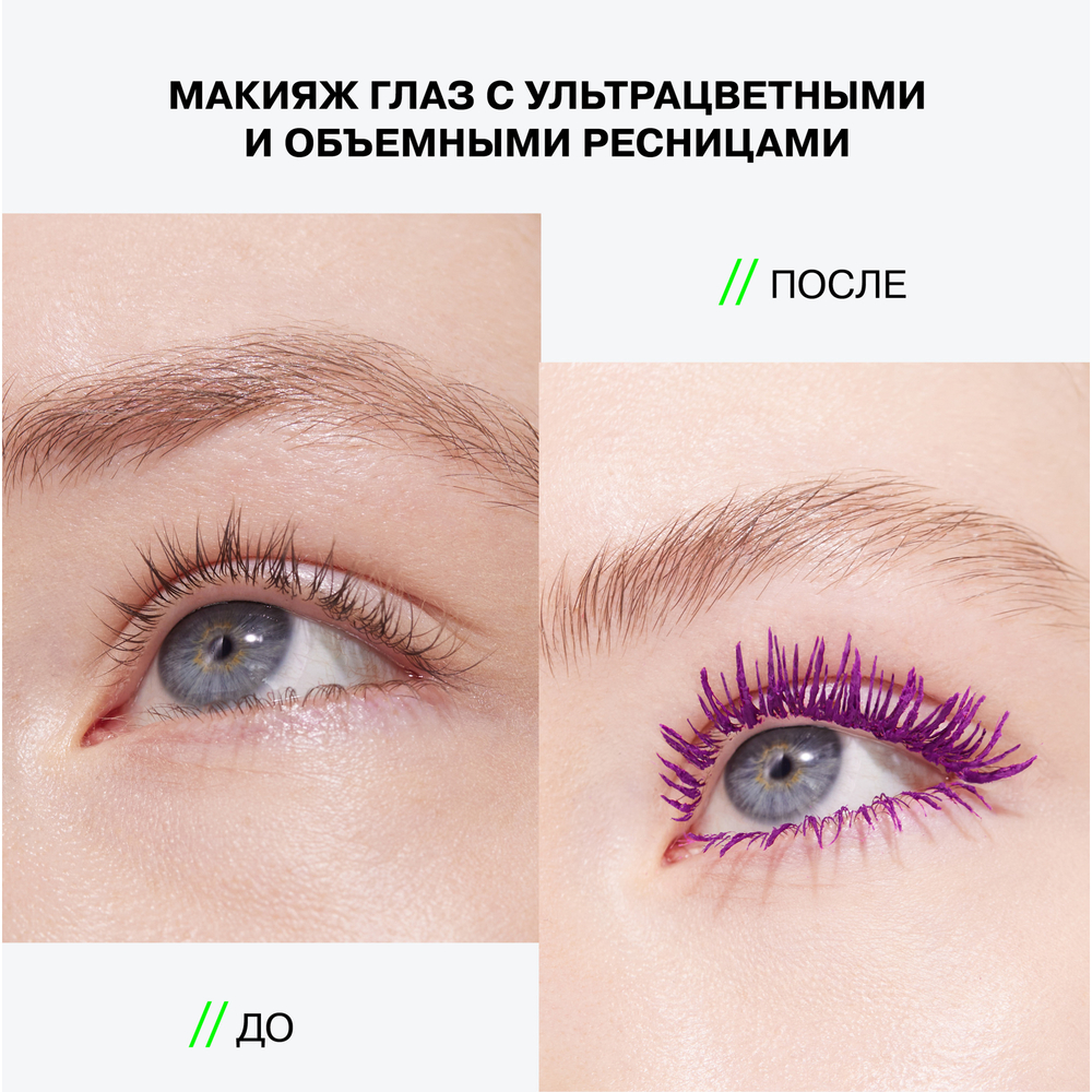 Тушь представлена в пяти насыщенных оттенках: синем, фиолетовом, зеленом, неоновом розовом и черном. С каждым из них ваш взгляд с объемными и длинными ресницами будет притягивать внимание. С "Chromophora" вдохновляйтесь игрой цвета и создавайте яркие неоновые образы.