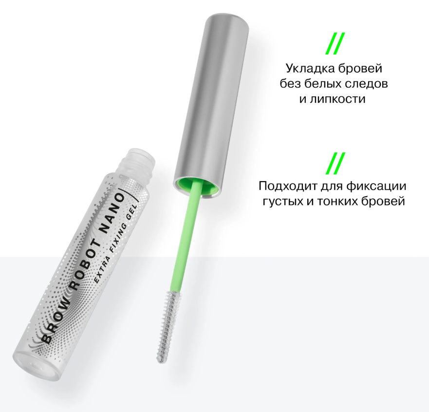Его уникальность заключается в инновационной технологии NANOFIX – сочетании формулы для быстрой фиксации без белых следов и ультратонкой щеточки с гибкими нановорсинками. Благодаря этому гель создает стойкую укладку бровей с эффектом ламинирования.