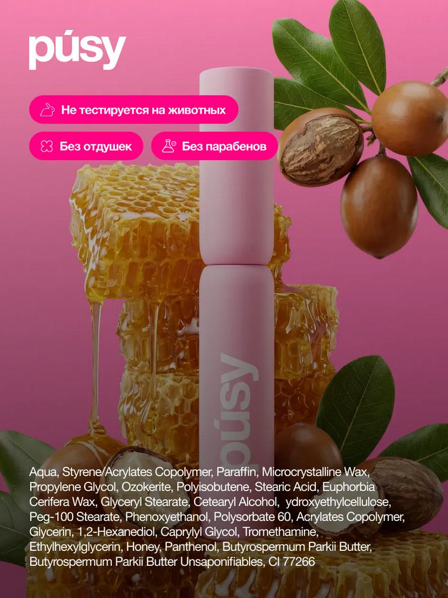 Канделильский воск сохраняет влагу внутри волоса, а масло ши и мёд увлажняют и питают ресницы. Тушь влагостойкая, не отпечатывается, не оставляет следов и не осыпается в течение дня.