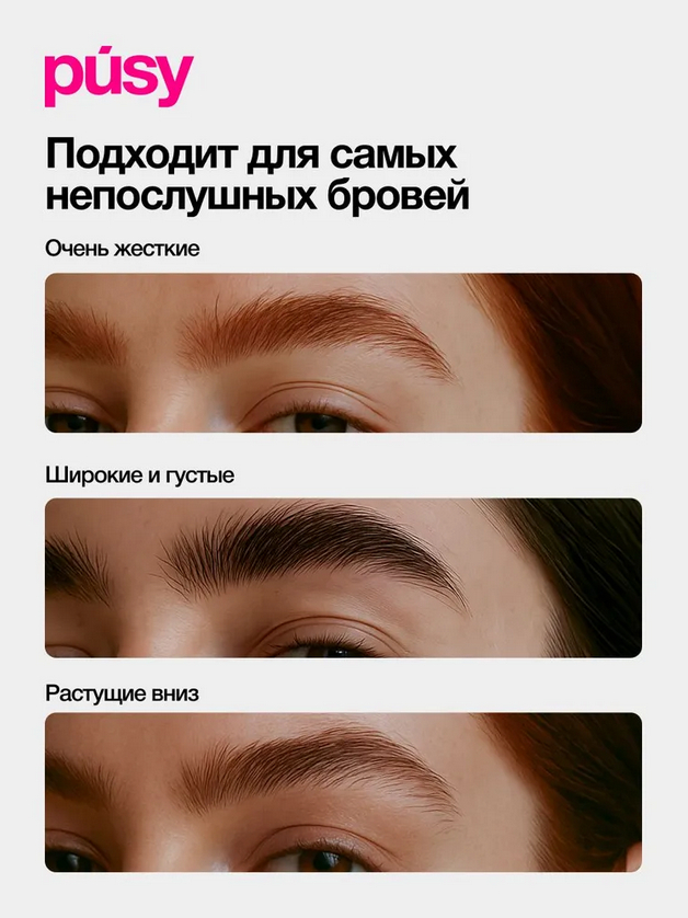 Нанесите небольшое количество геля на брови, зачёсывая лёгкими движениями волоски наверх у основания брови и по направлению роста волос ближе к кончику.Состав
