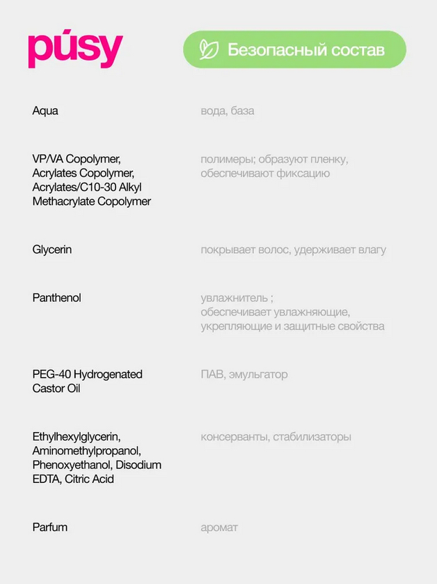 Aqua, VP/VA Copolymer, Glycerin, Acrylates Copolymer, Acrylates/C10-30 Alkyl Methacrylate Copolymer, Aminomethypropanol, Panthenol, PEG-40 Hydrogenated Castor Oil, Ethylhexylglycerin, Phenoxyethanol, Parfum, Disodium EDTA, Citric Acid.Мы используем файлы cookie для обеспечения удобства работы с сайтом и его контакта с пользователем.