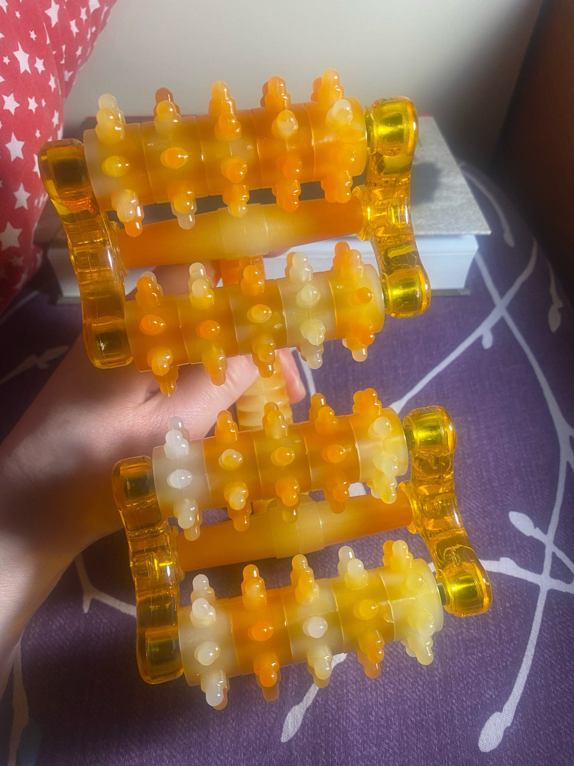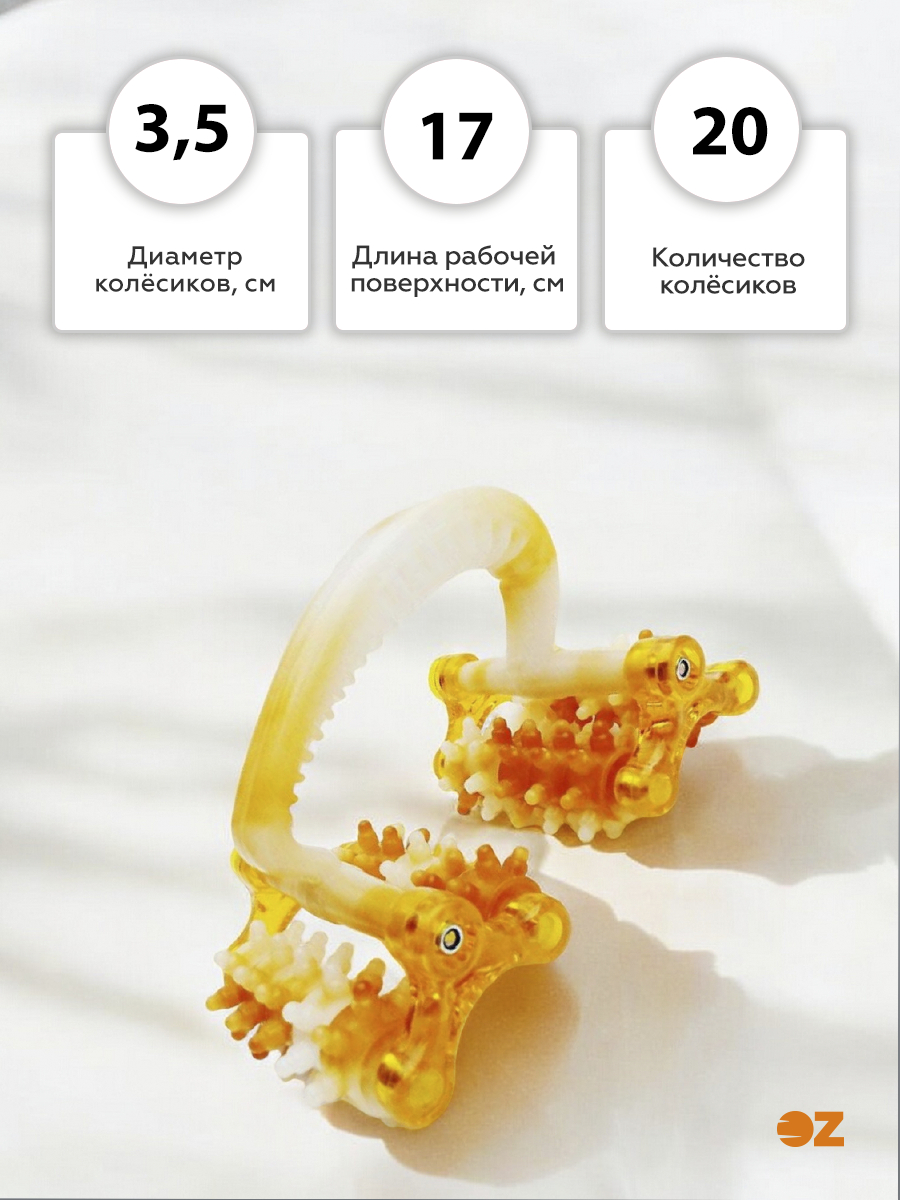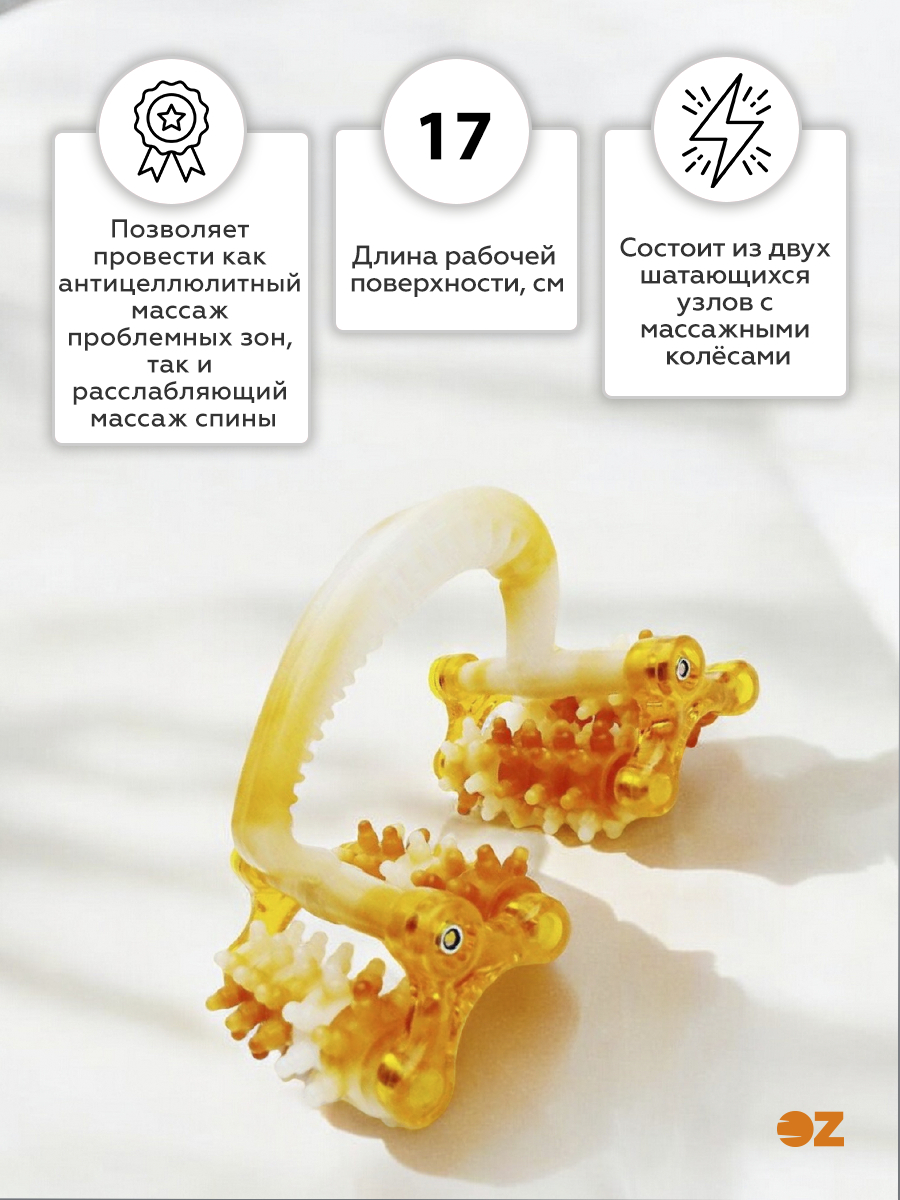 Массажёр позволяет провести как антицеллюлитный массаж проблемных зон, так и расслабляющий массаж спины. Рекомендован для релаксации после занятий спортом. Массажёр состоит из двух шатающихся узлов с массажными колёсами.