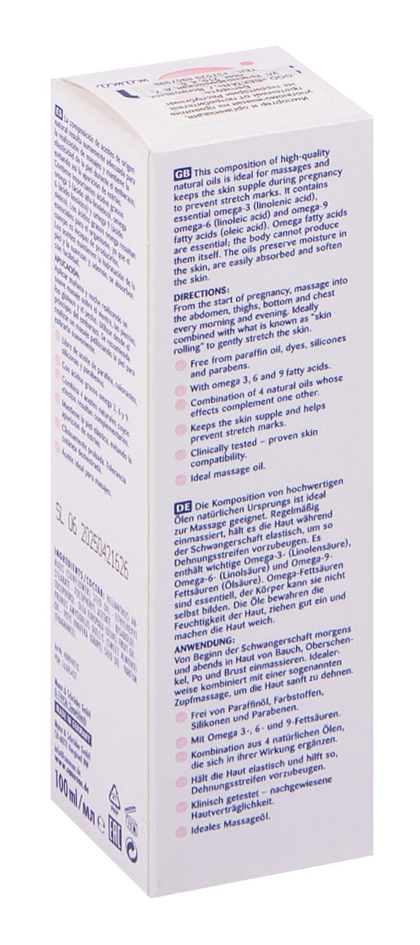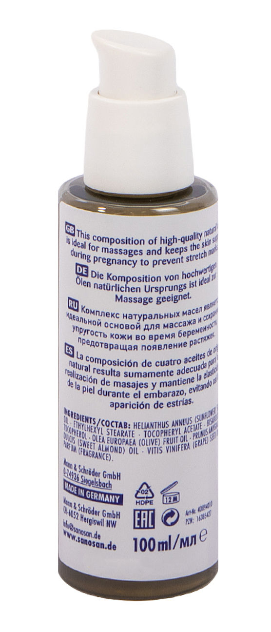 На 97% состоит из натуральных масел: подсолнечного, миндального и масла жожоба, содержит витамин А. При регулярном применении повышает эластичность кожи и предотвращает формирование растяжек. Как увлажняющее и питательное средство подходит для ежедневного ухода за чувствительной и склонной к сухости кожей.
