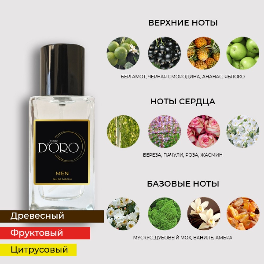 Аромат обладает богатой структурой, где доминируют нотки древесины, фруктов и цитрусовых. В его пирамиде можно уловить бергамот, черную смородину, ананас, яблоко, березу, пачули, розу, жасмин, мускус, дубовый мох и ваниль.