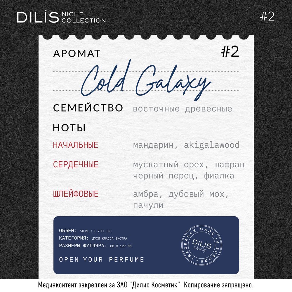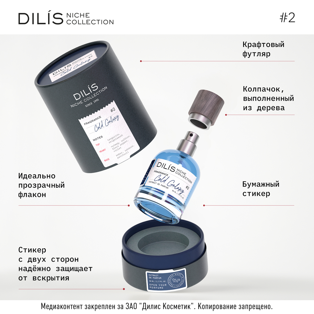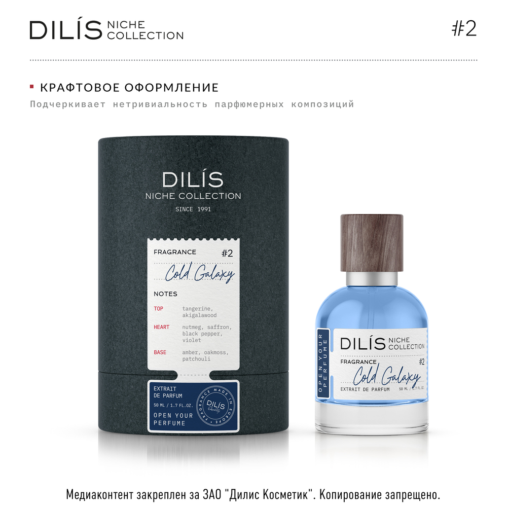 Cold Galaxy от Dilis Niche Collection – это утонченное творение переносит на берега космического океана. С первых нот он вызывает ощущение просторов, заряжая энергией кристально чистого воздуха. Элегантный и современный, Cold Galaxy объединяет в себе аккорды минеральных и древесных нот. Аромат ассоциируется с бесконечным пространством и безграничными возможностями.