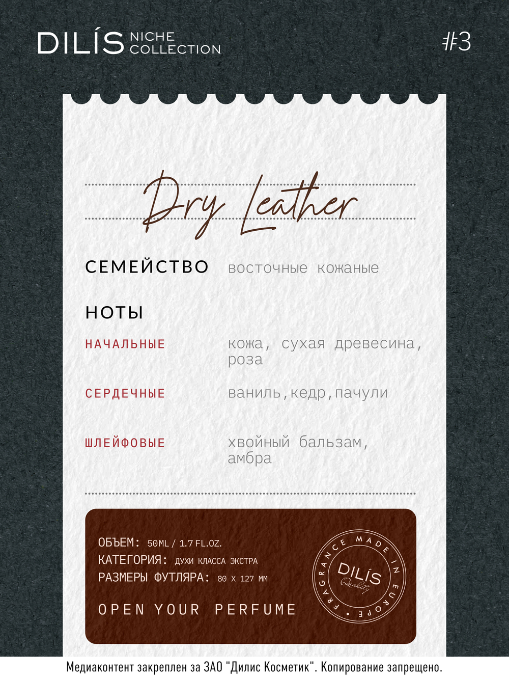 Dry leather – это аромат для настоящих ценителей, воплощающий статность и страсть. Каждая деталь этого аромата – от начальных нот до шлейфа – говорит о силе, которая разливается по телу с первого вдоха.