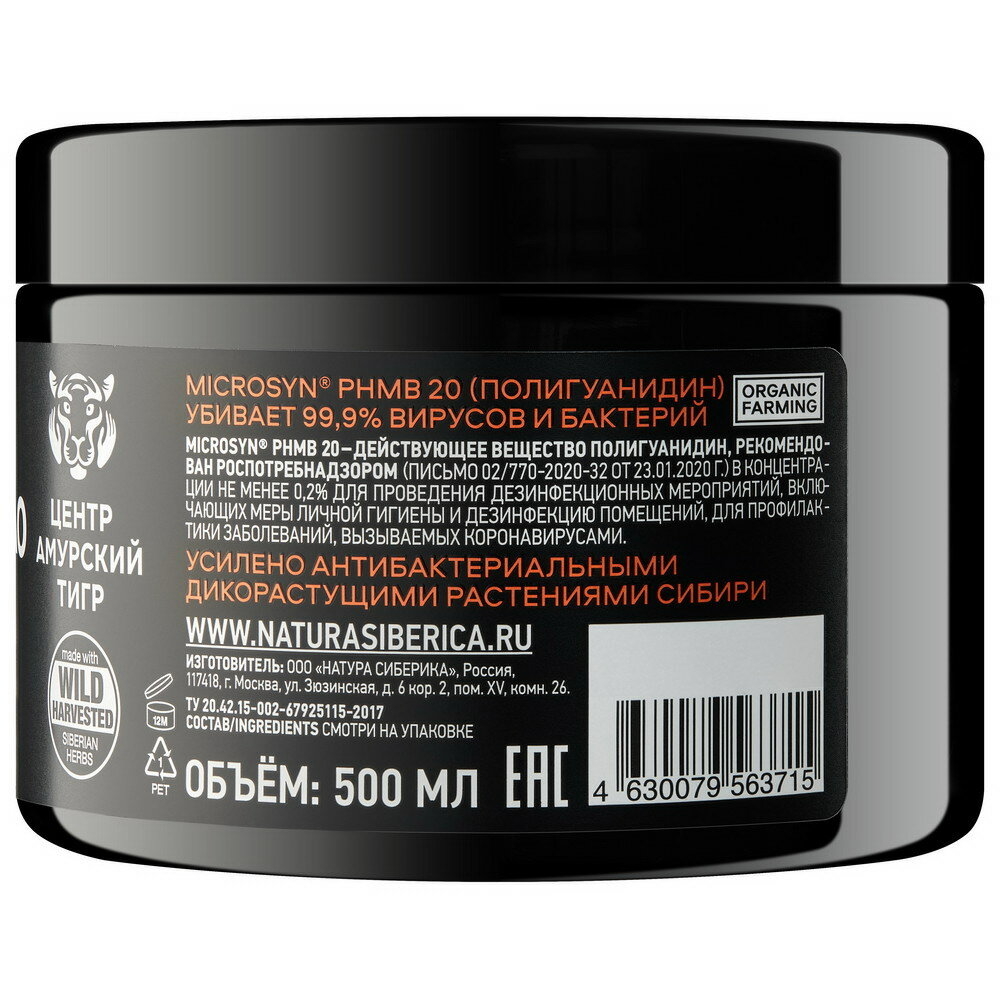 Aqua with infusions of Polyaminopropyl Biguanide (антибактериальный компонент MICROSYN® PHMB 20), Chamomilla Recutita Flower Extract* (экстракт ромашки тувинской), Thymus Vulgaris Leaf Extract* (экстракт дикого саянского тимьяна), Abies Holophylla Wood Oil* (масло черной пихты), Centella Asiatica Leaf Extract (экстракт тигровой травы), Nigella Sativa Seed Extract (экстракт семян черного тмина), Juniperus Sibirica Needle ExtractWH (экстракт можжевельника таежного), Pinus Sibirica Seed OilWH (масло сибирского кедра), Althaea Officinalis Leaf Extract* (экстракт алтея лекарственного), Arctostaphylos Uva Ursi Leaf ExtractWH (экстракт толокнянки сибирской), Urtica Dioica ExtractWH (экстракт крапивы двудомной), Hydrogenated Starch Hydrolysate, Decyl Glucoside, Sodium Coco-Sulfate, Xanthan Gum, Cellulose Gum, Linum Usitatissimum Seed Oil, Guar Hydroxypropyltrimonium Chloride, Panthenol, Citric Acid, Benzyl Alcohol, Parfum, CI 15985, CI 19140, CI 42090, CI 14720.