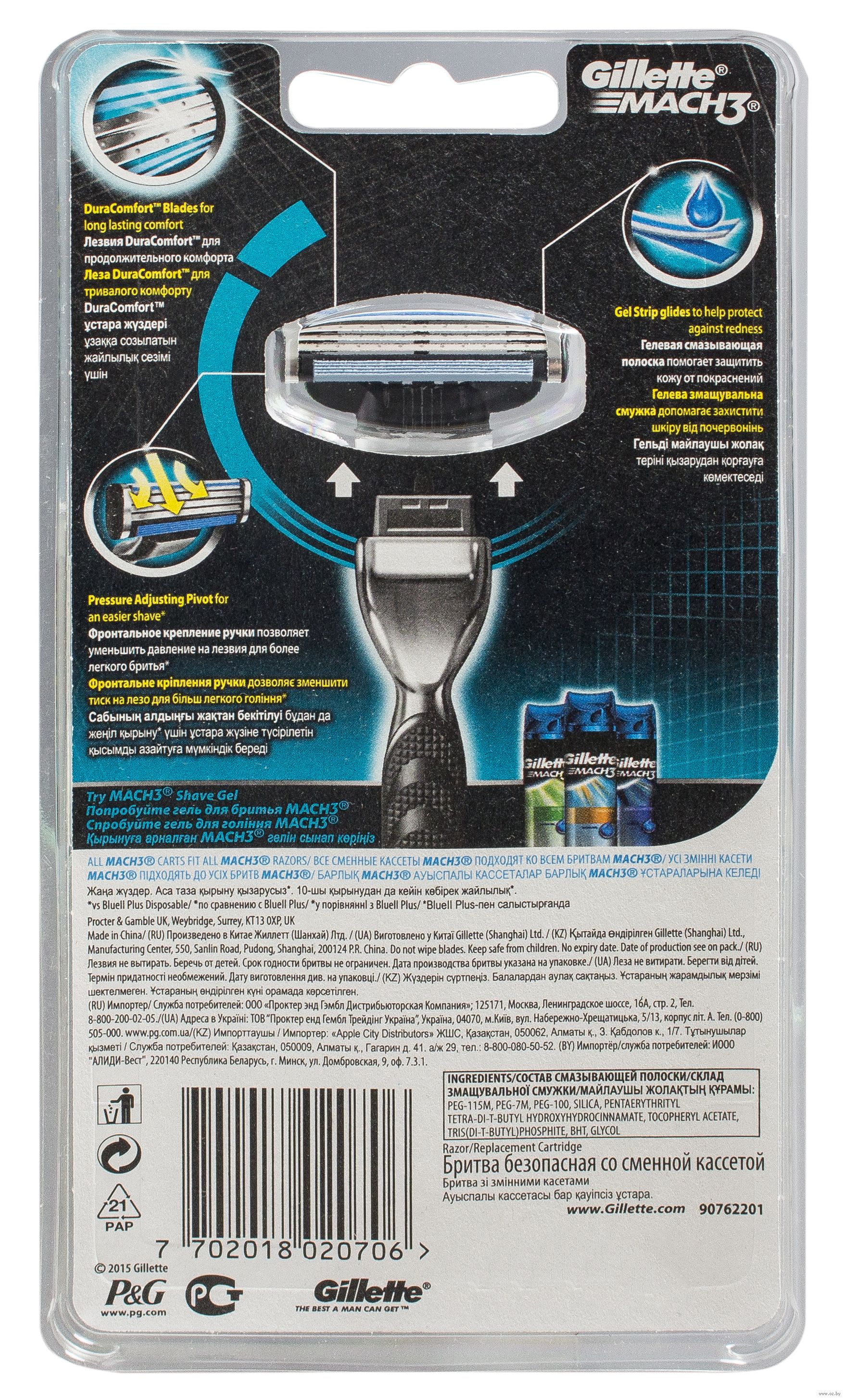 Три лезвия специально установлены на разных уровнях таким образом, чтобы брить еще чище всего одним движением. Так что возникает меньше необходимости брить снова, а это уменьшает раздражение. Острие каждого лезвия имеет уникальное покрытие так что Mach3 скользит по Вашему лицу комфортно и без всяких усилий. Mach3 имеет усовершенствованную Indikator смазывющую полоску с голубой полоской, которая исчезает когда Mach3 больше не обеспечивает наилучший эффект.