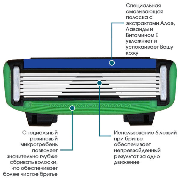 Использование 6 лезвий при бритье обеспечивает непревзойденный результат за одно движение. Легкое промывание всех 6 лезвий благодаря открытой архитектуре обратной стороны картриджа. Специальная смазывающая полоска с экстрактами Алоэ, Лаванды и Витамином Е увлажняет и успокаивает Вашу кожу.