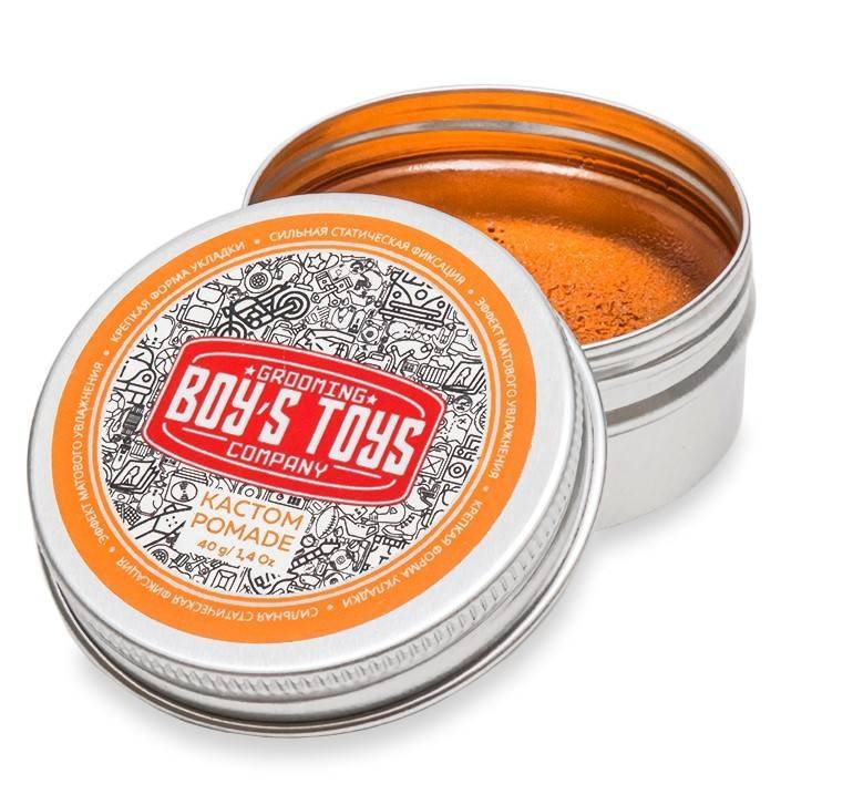 Кастом Pomade очень прост в нанесении, время схватывания на волосах позволяет поставить самый сложный "помп", обладает сильной фиксацией, придает волосам низкий уровень блеска и имеет выдающуюся для "помад" пластику.