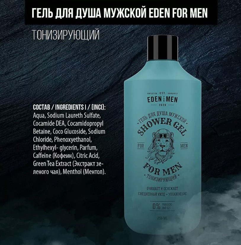 Aqua, Sodium Laureth Sulfate, Cocamide DЕА, Сocamidopropyl Betaine, Coco Glucoside, Sodium Chloride, Phenoxyethanol, Ethylhexyl- glycerin, Parfum, Caffeine (Кофеин), Citric Acid, Green Tea Extract (Экстракт зеленого чая), Menthol (Ментол).