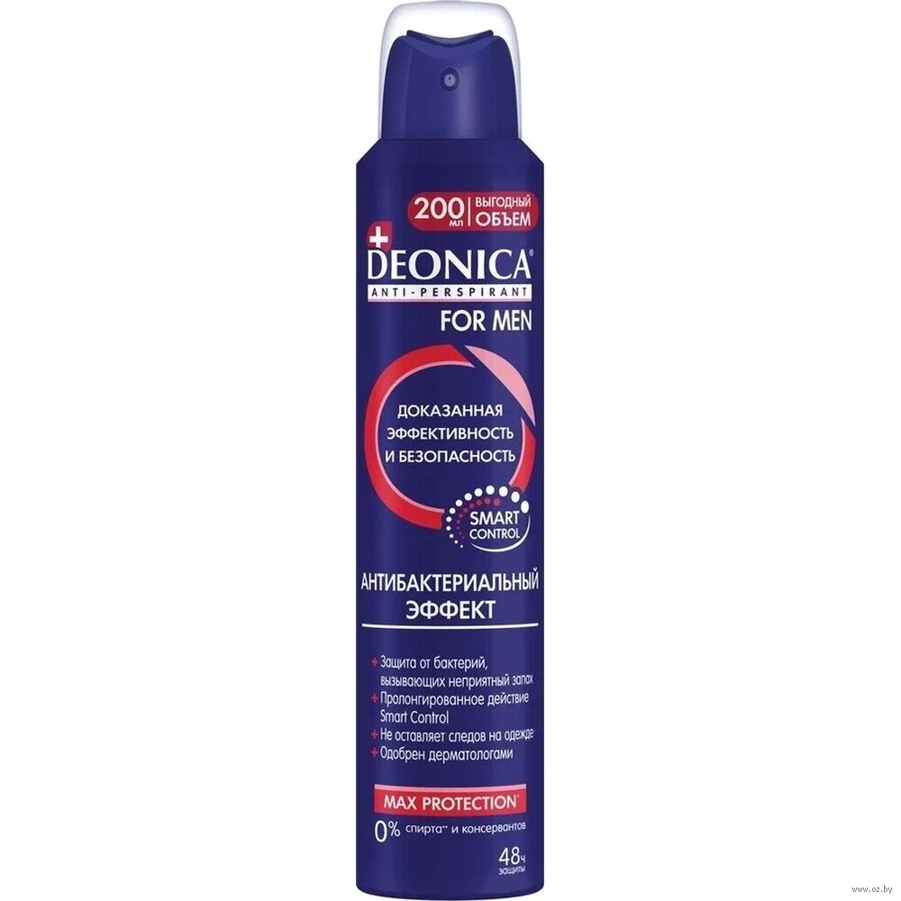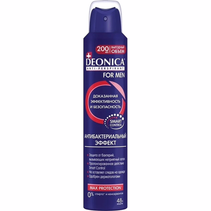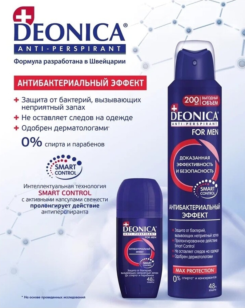 Уникальный мужской антиперспирант Deonica "Антибактериальный эффект for MEN" благодаря специальной формуле с антибактериальным комплексом устраняет саму причину неприятного запаха – бактерии, не оставляет следов и пятен на белой, черной и цветной одежде. Обеспечивает надежную защиту от пота и запаха на 48 часов.& Эффективный компонент SymDeo в составе антиперспиранта защищает кожу от бактерий, вызывающих неприятный запах.