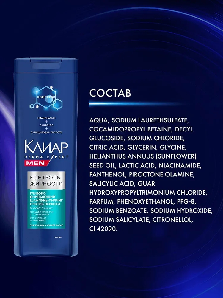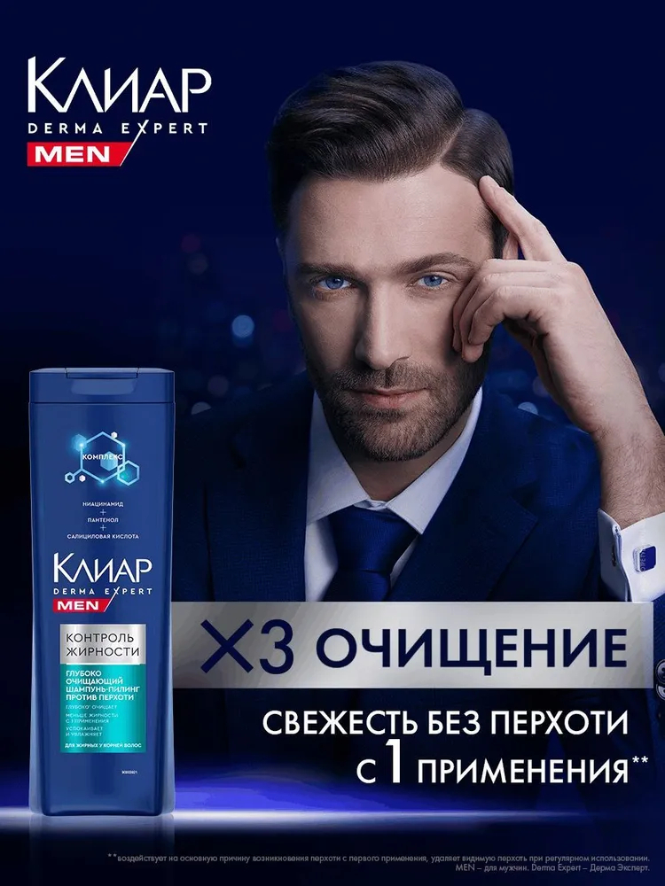 Новая формула глубоко очищающего шампуня-пилинга Clear Men "Derma Expert" разработана с учетом особенностей мужской кожи головы, склонной к жирности.
