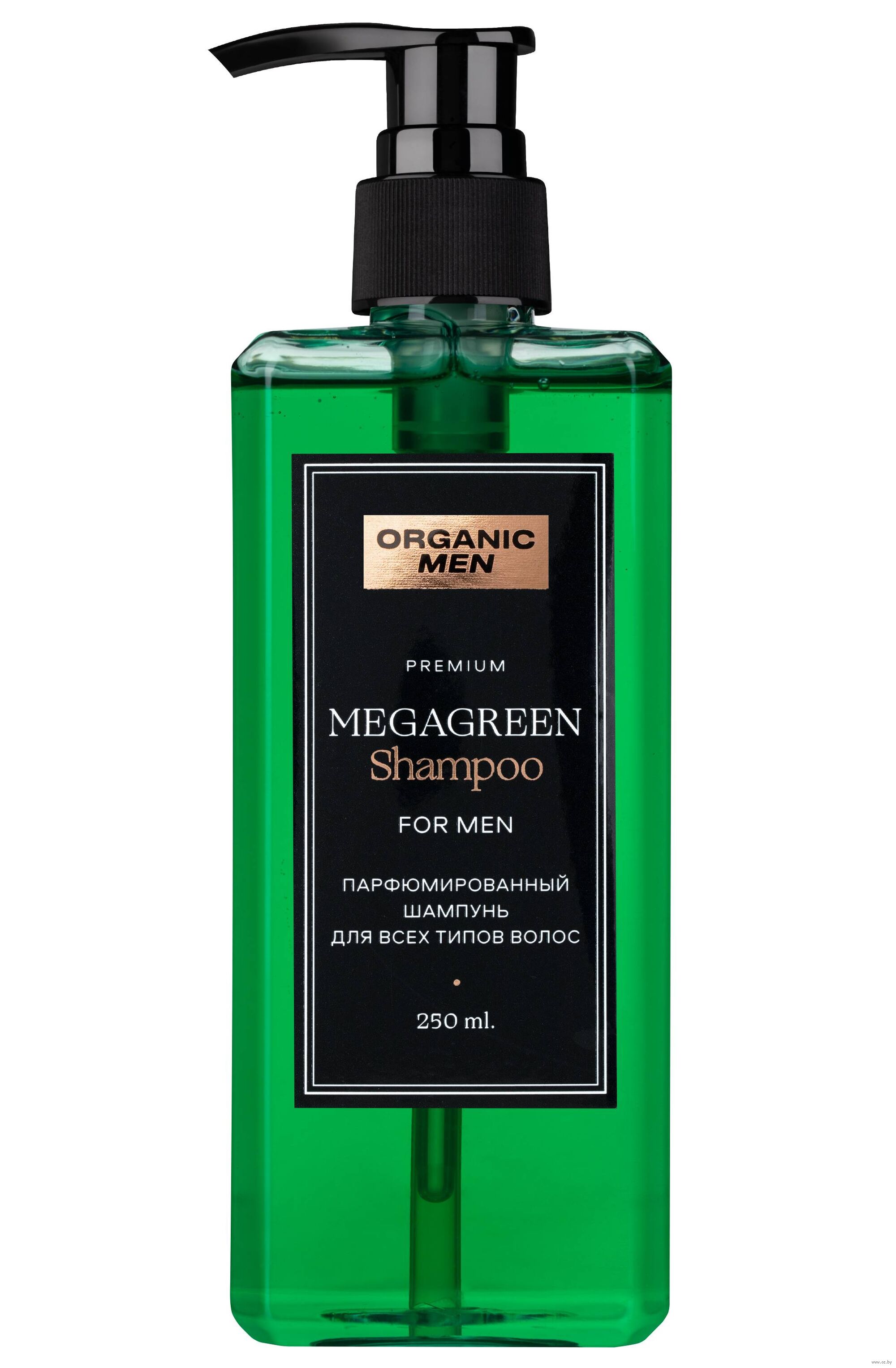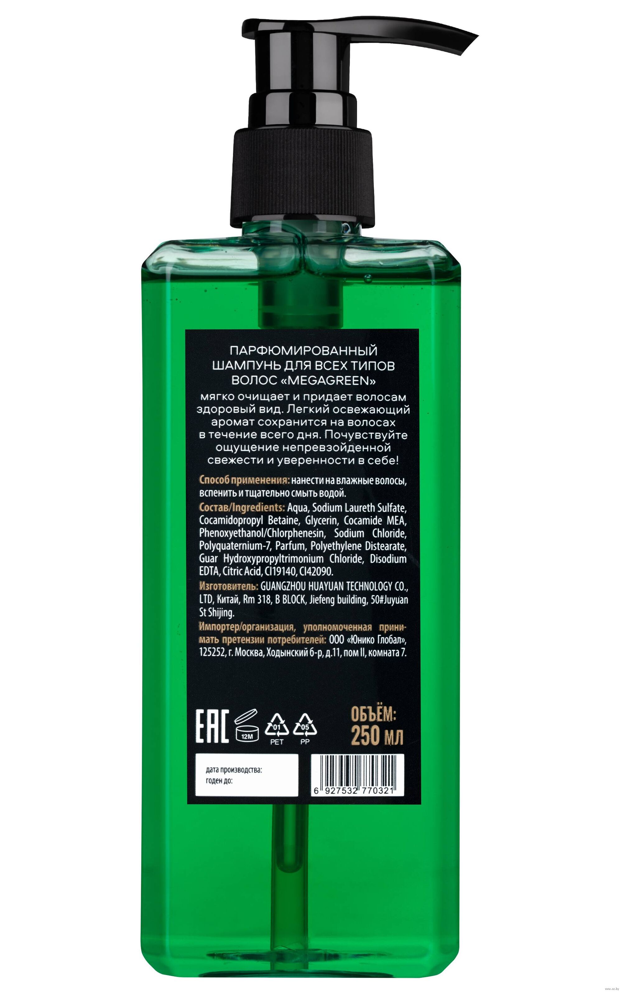 Парфюмированный шампунь для всех типов волос "Mega Green" подходит для всех типов волос, мягко очищает и придает волосам здоровый вид.
