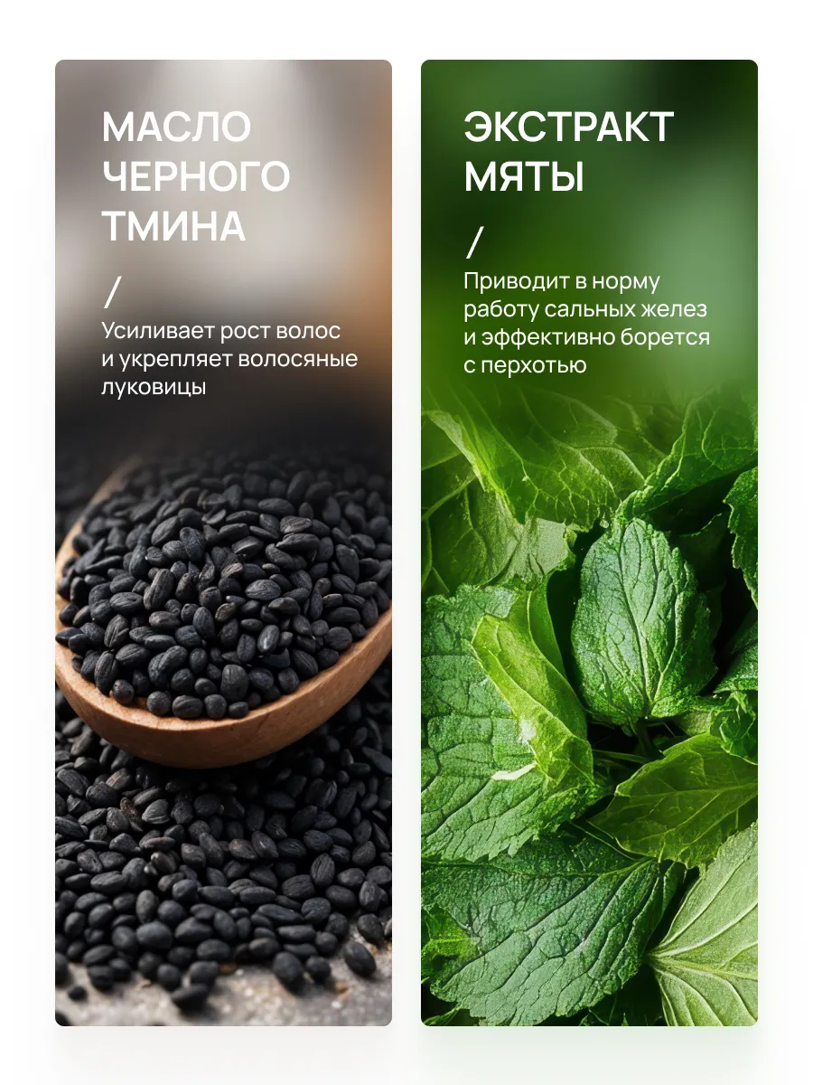 Масло черного тмина в составе усиливает рост волос и укрепляет волосяные луковицы. Экстракт мяты приводит в норму работу сальных желез и эффективно борется с перхотью.