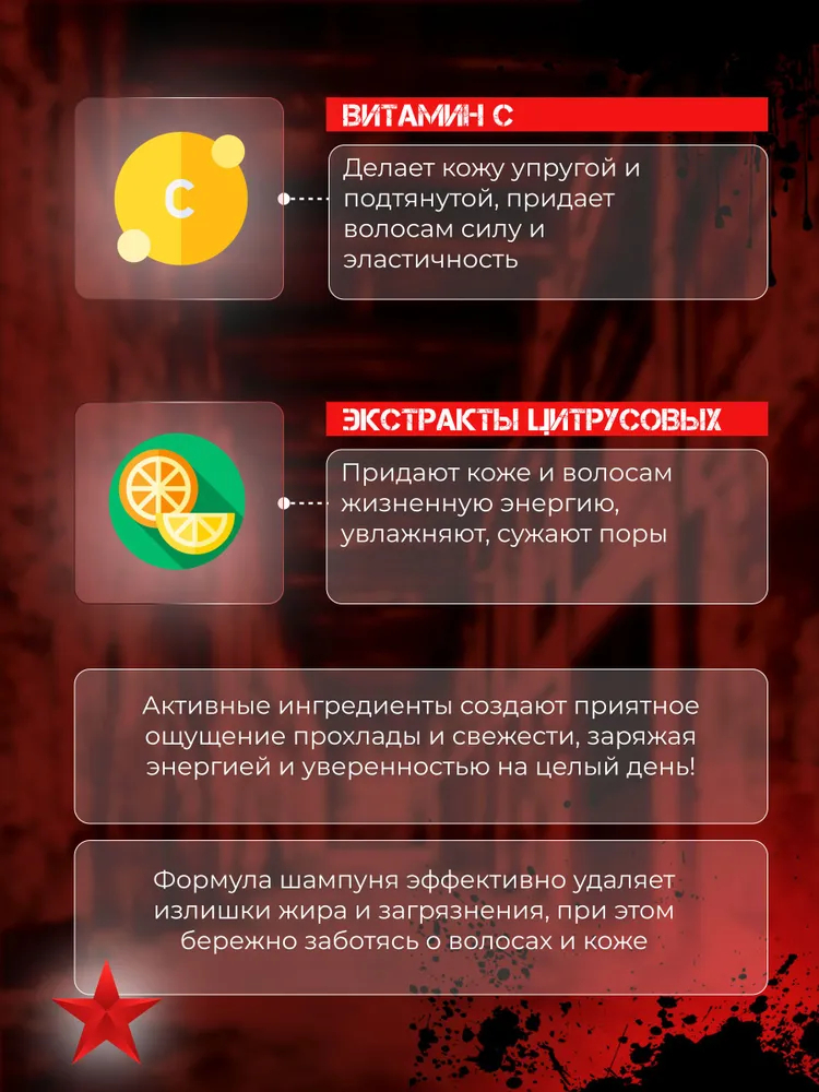 Шампунь-гель обладает тонизирующим действием и обеспечивает заряд бодрости на целый день. Формат 2в1 позволяет использовать одно средство для всего тела от макушки до пяток.