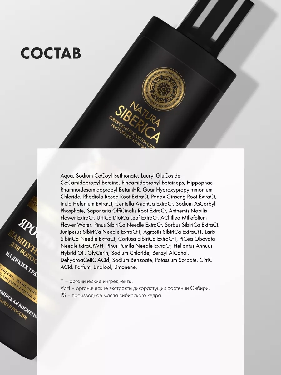 Aqua, Sodium Cocoyl Isethionate, Lauryl Glucoside, Cocamidopropyl Betaine, Pineamidopropyl Betaineps, Hippophae Rhamnoidesamidopropyl BetainHR, Guar Hydroxypropyltrimonium Chloride, Rhodiola Rosea Root Extract** (экстракт золотого корня), Panax Ginseng Root Extract (экстракт дикого женьшеня), Inula Helenium Extract (экстракт уссурийского девясила), Centella Asiatica Extract (экстракт тигровой травы), Sodium Ascorbyl Phosphate витамин С), Saponaria Officinalis Root Extract* (экстракт мыльнянки), Anthemis Nobilis Flower Extract* (экстракт ромашки), Urtica Dioica Leaf Extract* экстракт крапивы), Achillea Millefolium Flower Water* (экстракт тысячелистника), Pinus Sibirica Needle Extract™ (экстракт сосны кедровой сибирской), Sorbus Sibirica Extract* (экстракт рябины сибирской), Juniperus Sibirica Needle Extract1 (экстракт можжевельника сибирского), Agrostis Sibirica Extract1™ (экстракт полевицы сибирской), Larix Sibirica Needle Extract** (экстракт лиственницы сибирской), Cortusa Sibirica Extract1-(экстракт кортузы сибирской), Picea Obovata Needle txtractWH (экстракт ели сибирской), Pinus Pumila Needle Extract™ (экстракт кедрового стланика), Heliantus Annuus Hybrid Oil, Glycerin, Sodium Chloride, Benzyl Alcohol, Dehydroacetic Acid, Sodium Benzoate, Potassium Sorbate, Citric Acid. Parfum, Linalool*, Limonene.