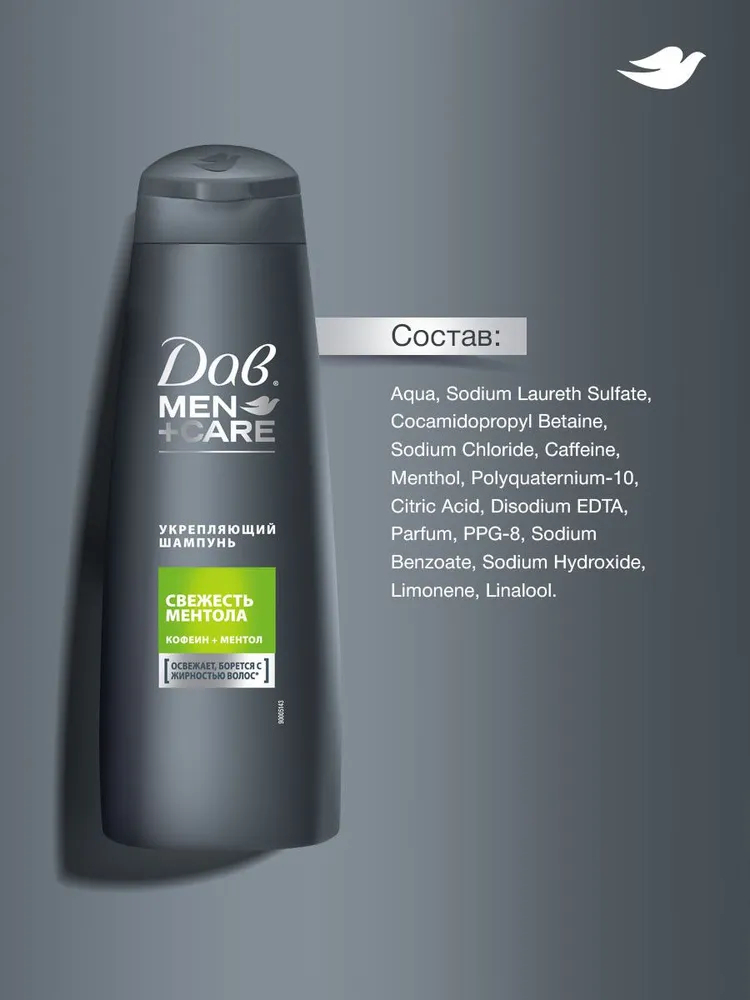 Ищете шампунь для жирных волос, который придаст ощущение свежести надолго? Укрепляющий шампунь Dove Men+Care Свежесть Ментола специально разработан для волос, склонных к жирности, для того, чтобы придать им здоровый вид, естественный блеск и свежесть. Укрепляющий мужской шампунь для жирных волос Dove Men+Care с кофеином и ментолом надолго придаст коже головы ощущение свежести. Шампунь 2 в 1 укрепляет волосы, наполняет их энергией и борется с излишней жирностью. Добавьте этот шампунь в ваш арсенал средств по уходу за собой, и ощущение свежести и чистоты останется с вами надолго.