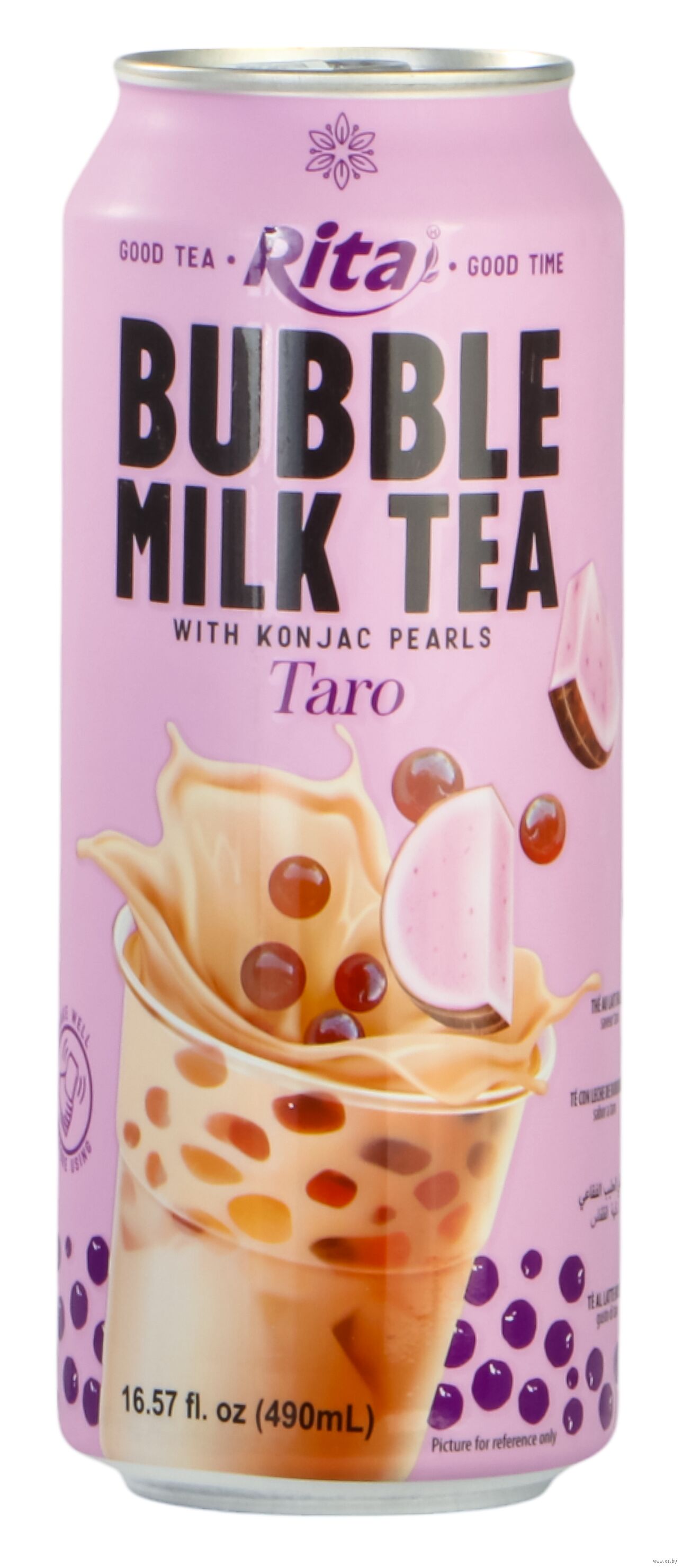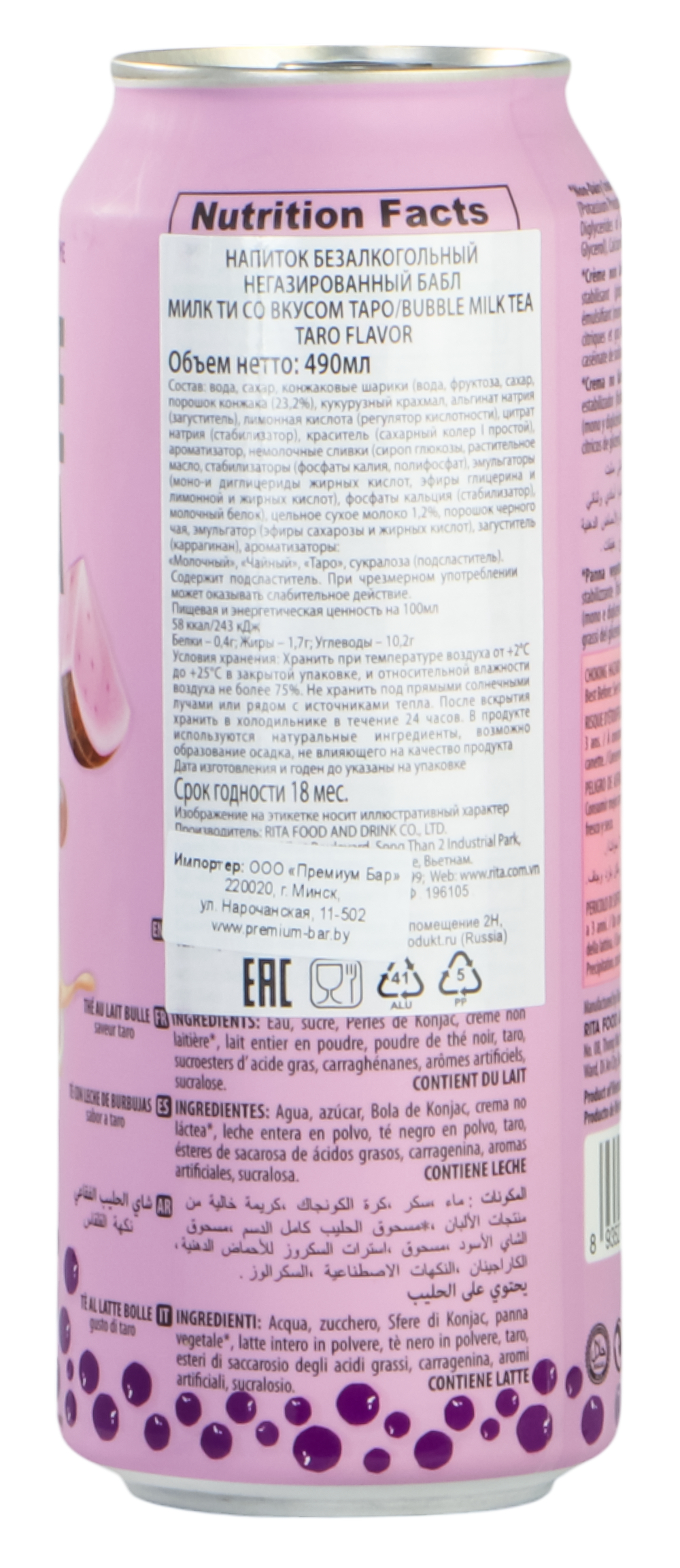 Вода, сахар, конжаковые шарики (вода, фруктоза, сахар, порошок конжака (23,2%), кукурузный крахмал, альгинат натрия(загуститель), лимонная кислота(регулятор кислотности), цитрат натрия (стабилизатор), краситель (сахарный колер I простой), ароматизатор, немолочные сливки (сироп глюкозы, растительное масло, стабилизаторы (фосфаты калия, полифосфат), эмульгаторы (моно- и диглицериды жирных кислот, эфиры глицерина и лимонной и жирных кислот), фосфаты кальция (стабилизатор), молочный белок), цельное сухое молоко 1,2%, порошок черного чая, эмульгатор (эфиры сахарозы и жирных кислот), загуститель (каррагинан), ароматизаторы: "Молочный", "Чайный", "Таро", сукралоза (подсластитель).