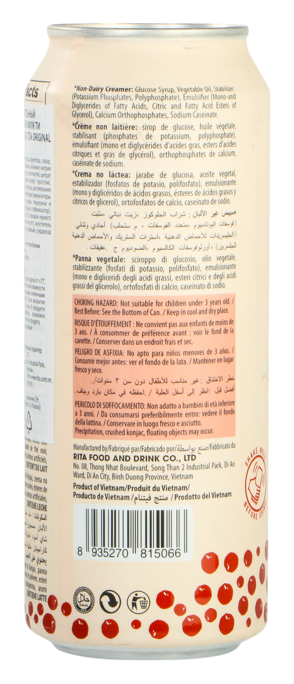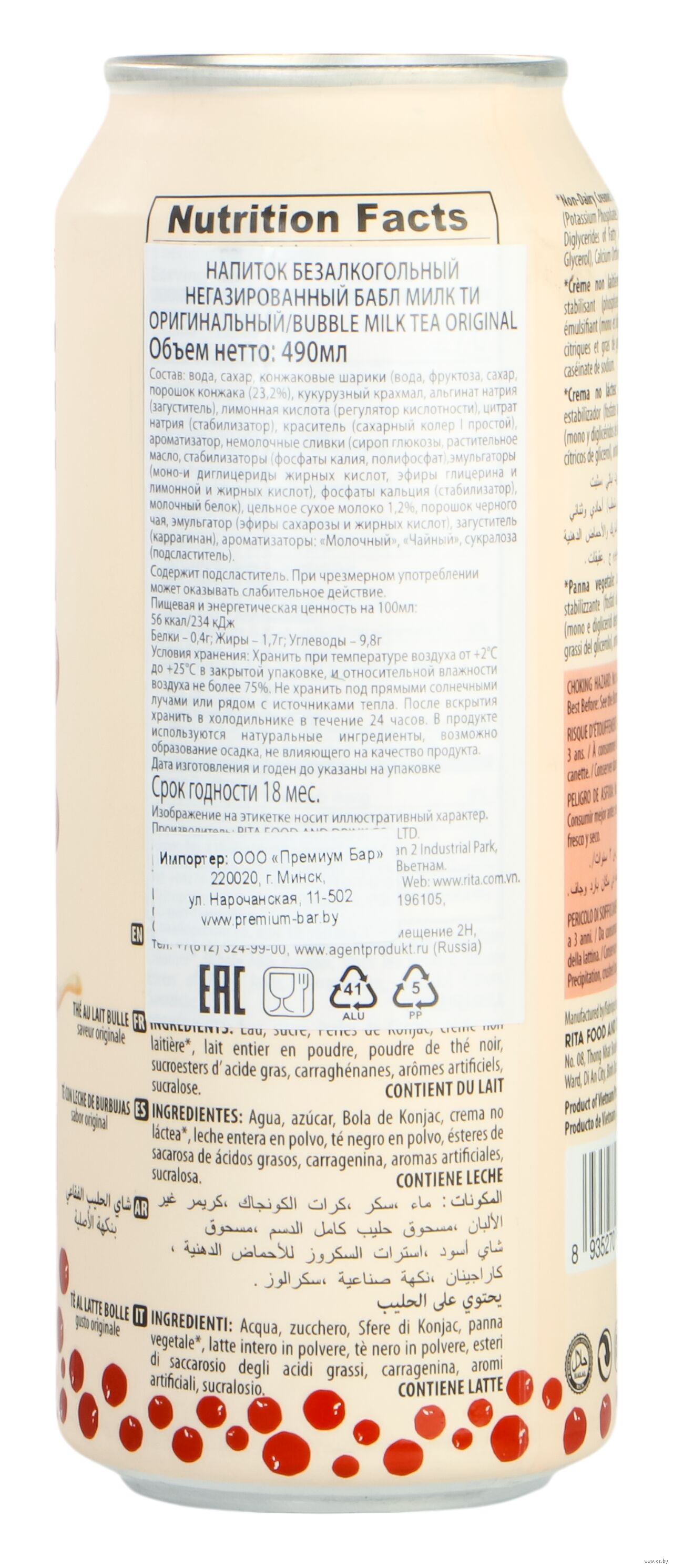 Вода, сахар, конжаковые шарики (вода, фруктоза, сахар, порошок конжака (23,2%), кукурузный крахмал, альгинат натрия(загуститель), лимонная кислота(регулятор кислотности), цитрат натрия (стабилизатор), краситель (сахарный колер I простой), ароматизатор, немолочные сливки (сироп глюкозы, растительное масло, стабилизаторы (фосфаты калия, полифосфат), эмульгаторы (моно- и диглицериды жирных кислот, эфиры глицерина и лимонной и жирных кислот), фосфаты кальция (стабилизатор), молочный белок), цельное сухое молоко 1,2%, порошок черного чая, эмульгатор (эфиры сахарозы и жирных кислот), загуститель (каррагинан), ароматизаторы: "Молочный", "Чайный", сукралоза (подсластитель).