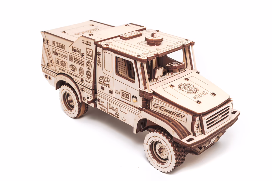 Экологически чистые материалы, качественная прорисовка элементов, эффектное сходство с оригиналом, наличие мощного резиномотора, который приводит в движение автомобиль, устройство заводки-запуска-остановки, поворотные колеса с механизмом управления и открывающиеся двери кабины доставят удовольствие от сборки и радость от использования как детям, так и взрослым.