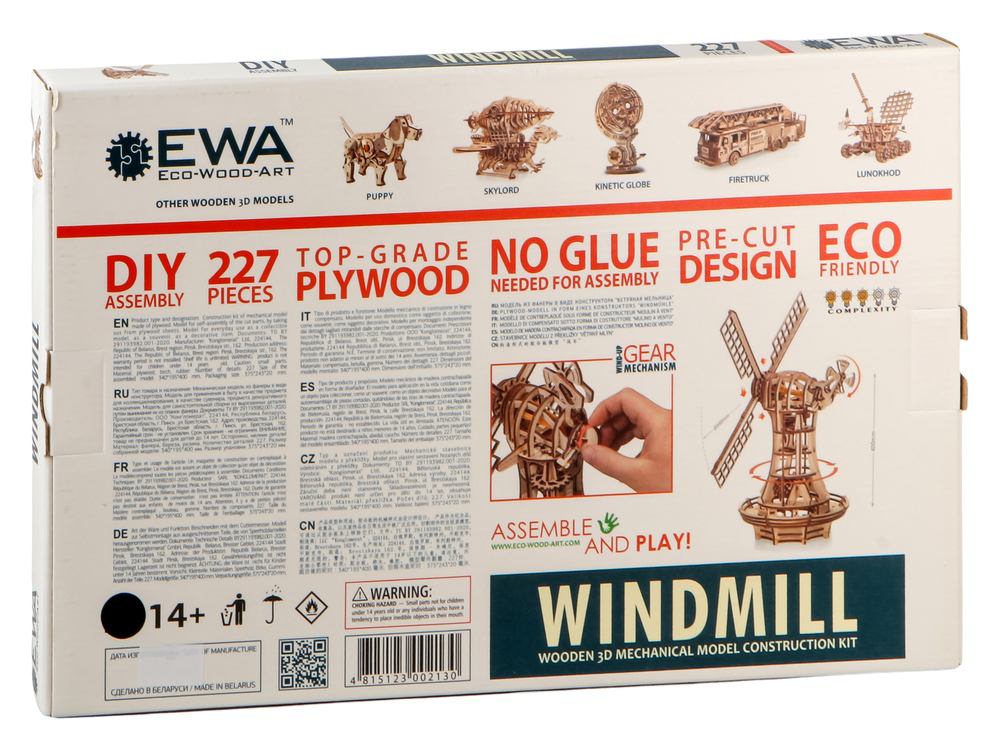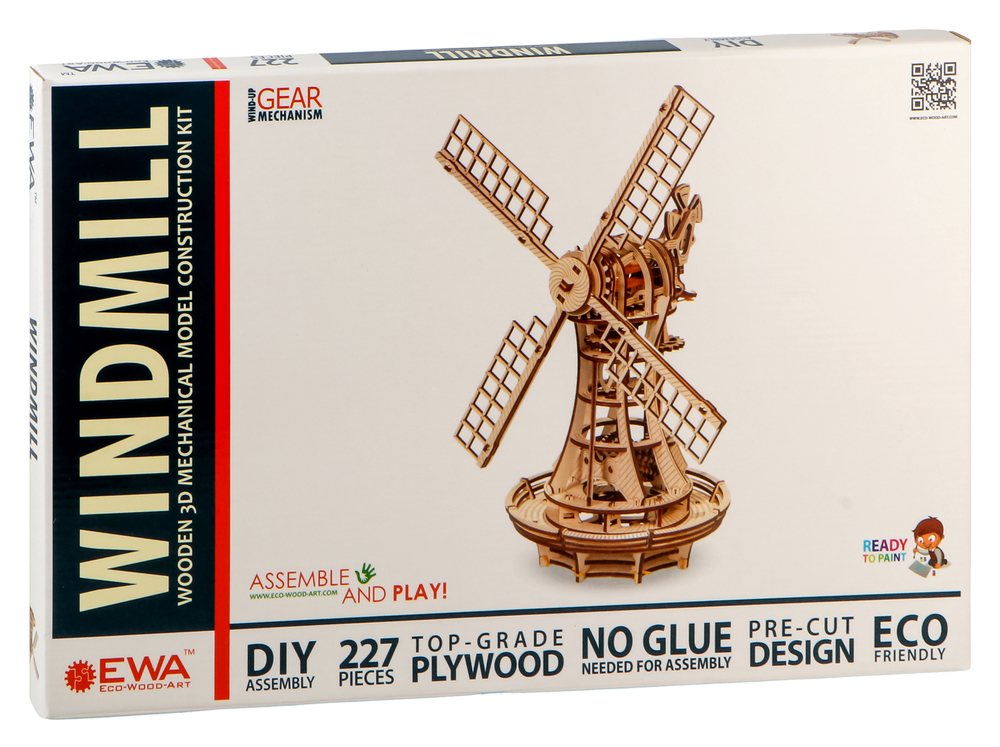 Механический деревянный конструктор "Ветряная мельница". Модель имеет заводной механизм поворота парусов на резинке и механизм открывания в башне.