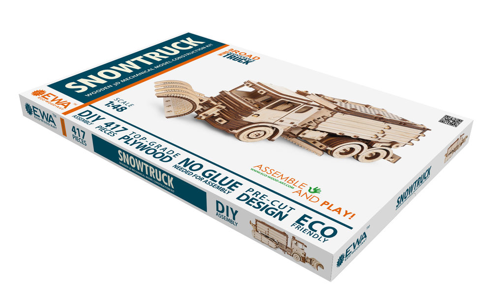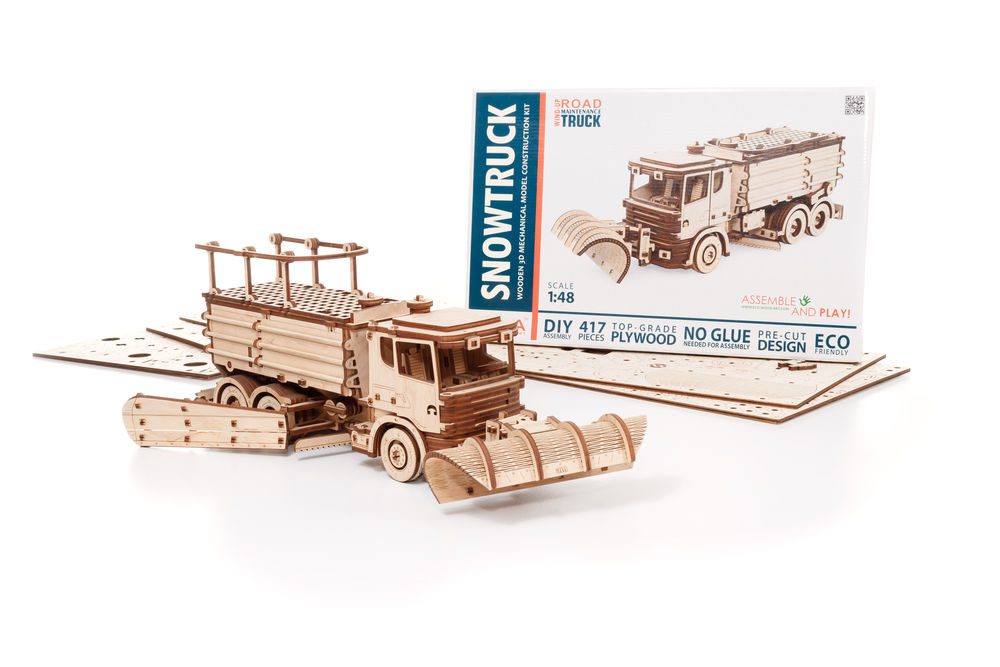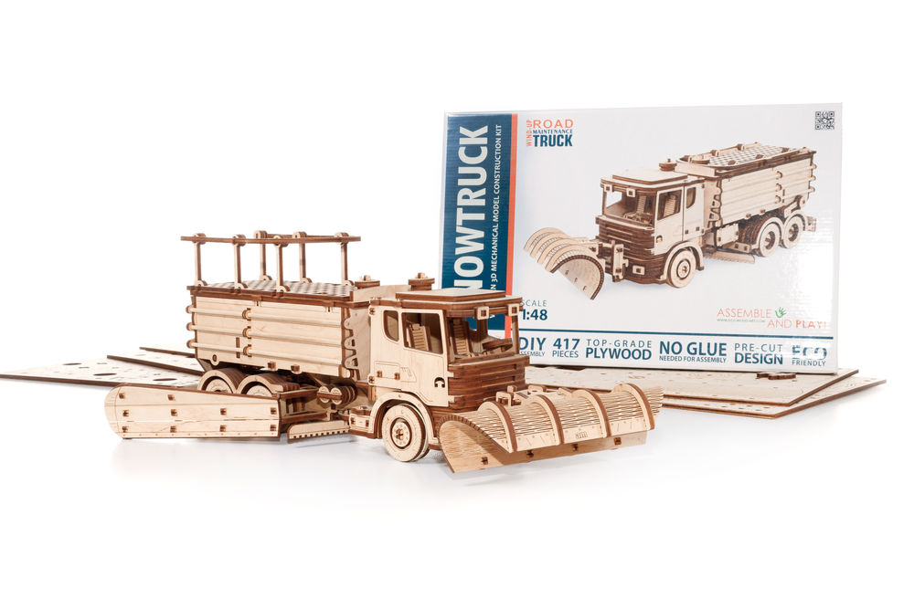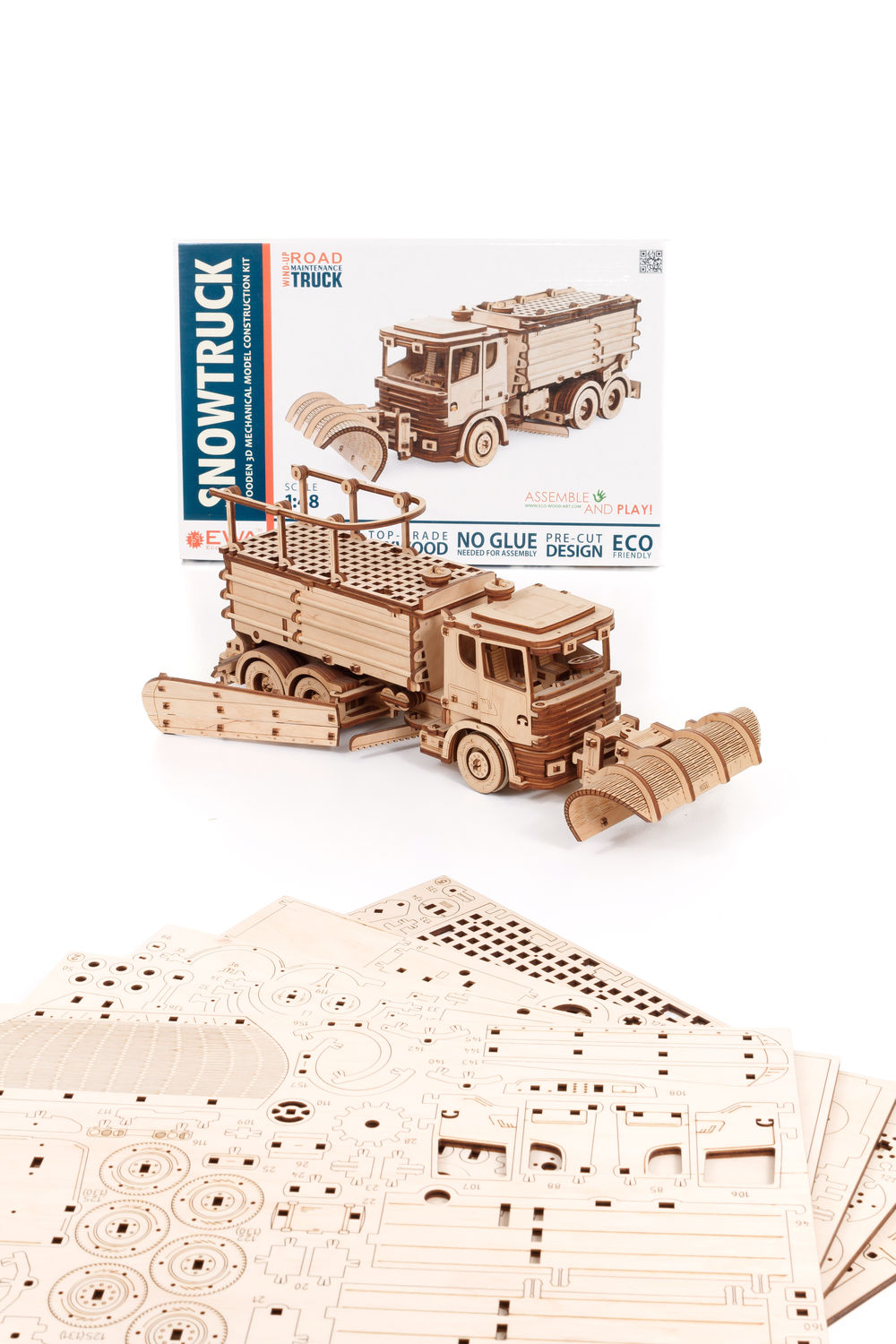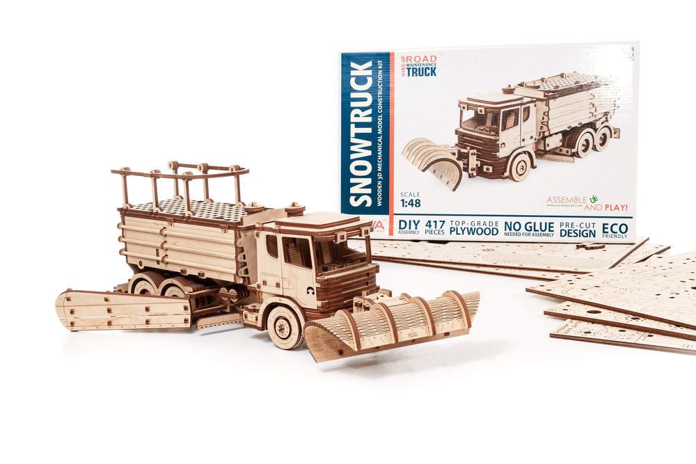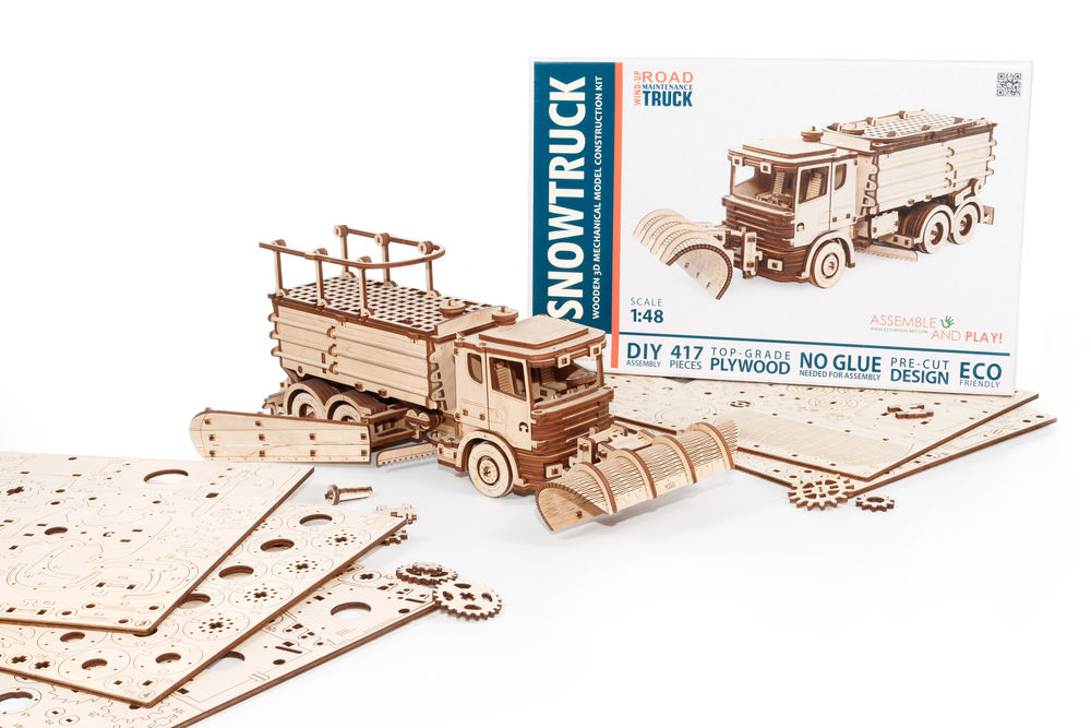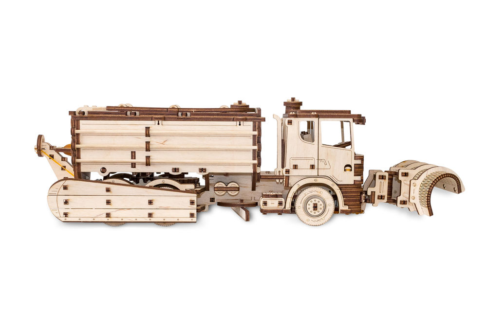 Механическая модель снегоуборочной машины с мощным резиномотором, поворотными передними колесами с удобным управлением на кабине, открывающимися дверцами кабины, тремя поворотными отвалами, съемным передним отвалом, откидным задним рассеивателем и складными поручнями.