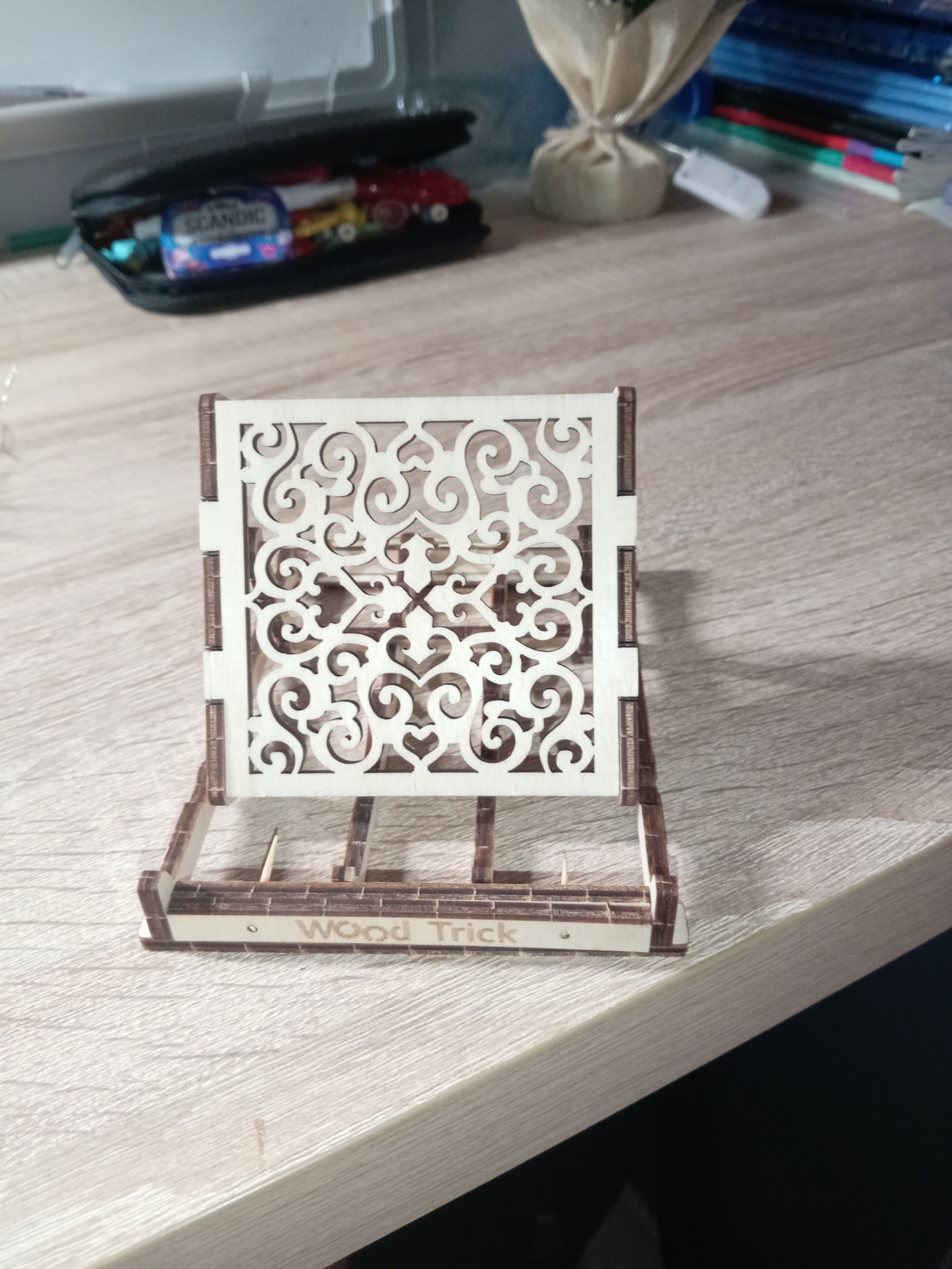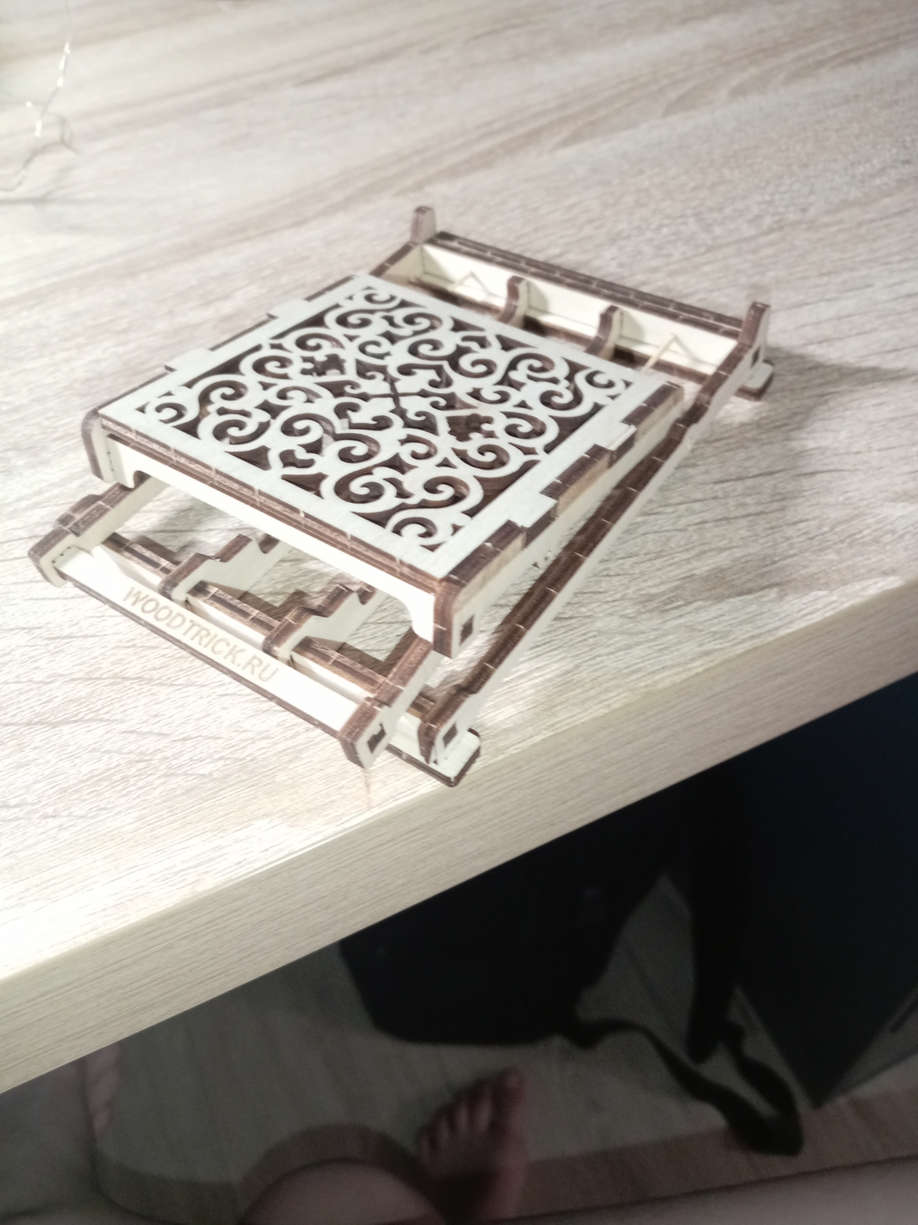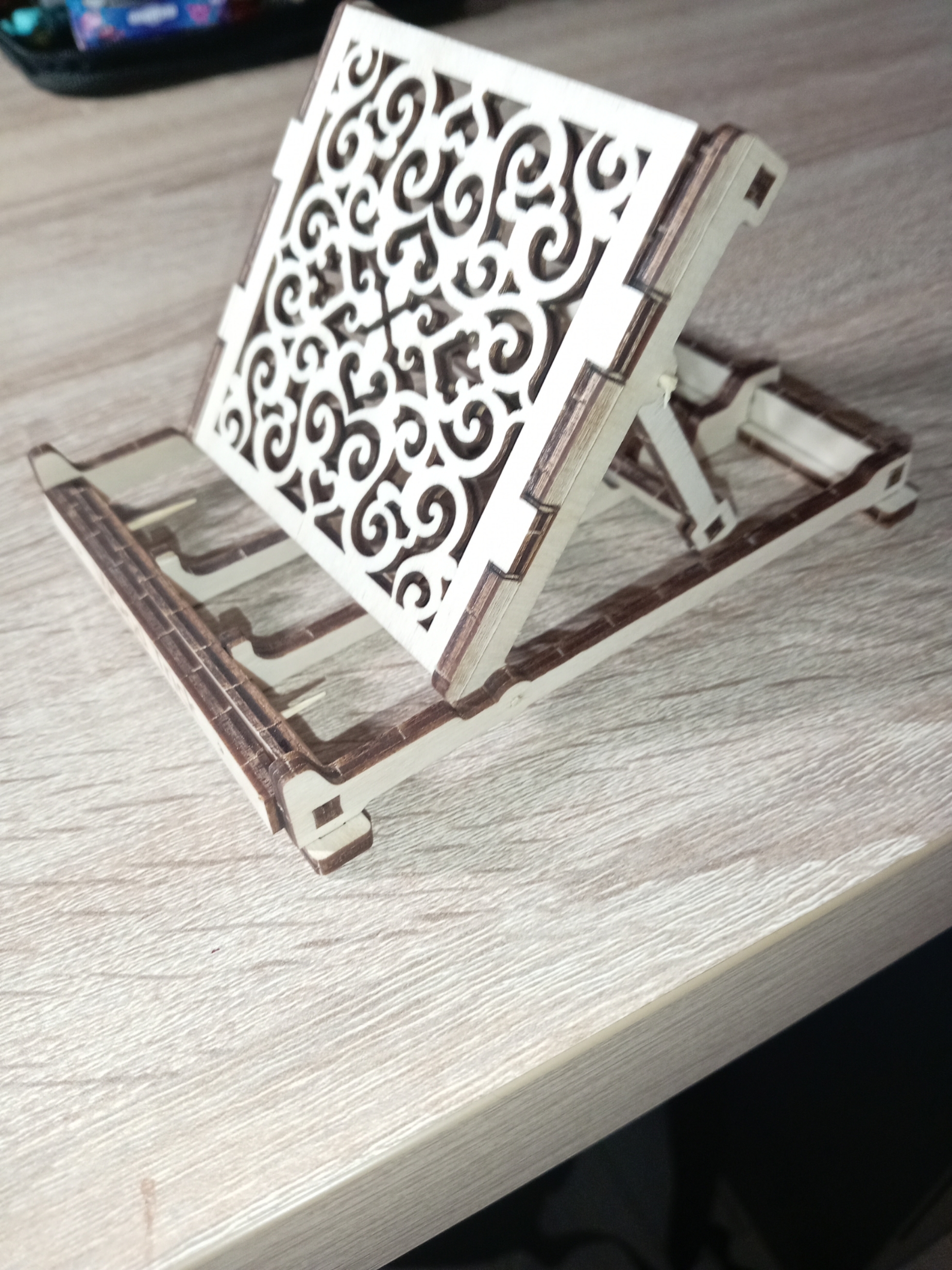 Разработана в виде деревянного конструктора, который собирается несколькими движениями руки, и регулируется уровень наклона.