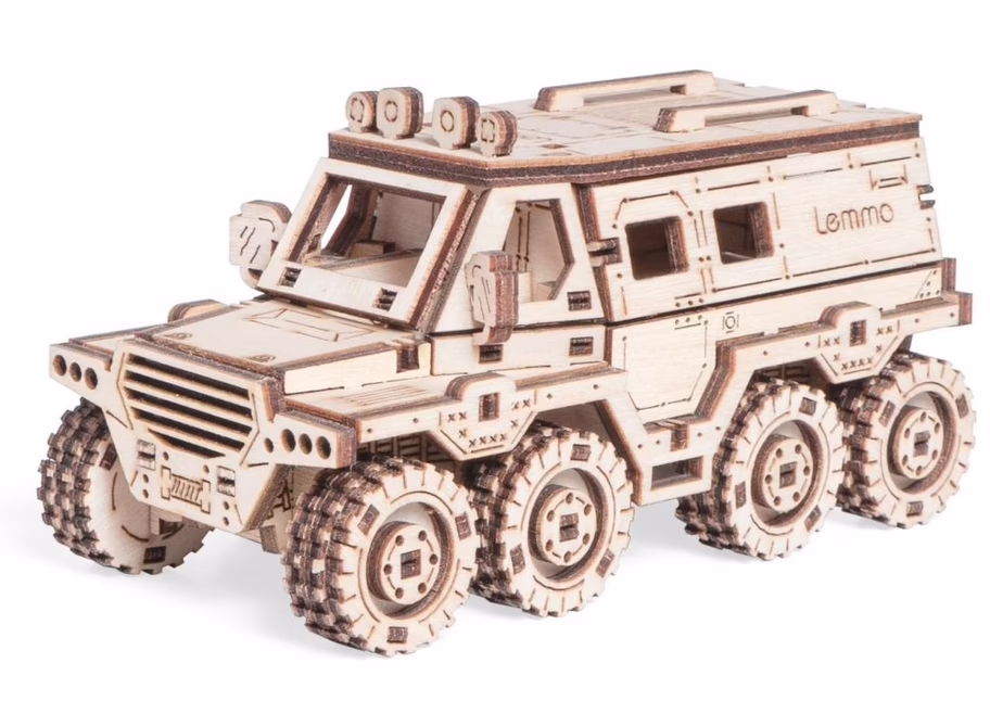 Деревянный конструктор и сборная модель из дерева автомобиль "Внедорожник Бархан" от фабрики деревянной игрушки "Леммо" для детей и взрослых.