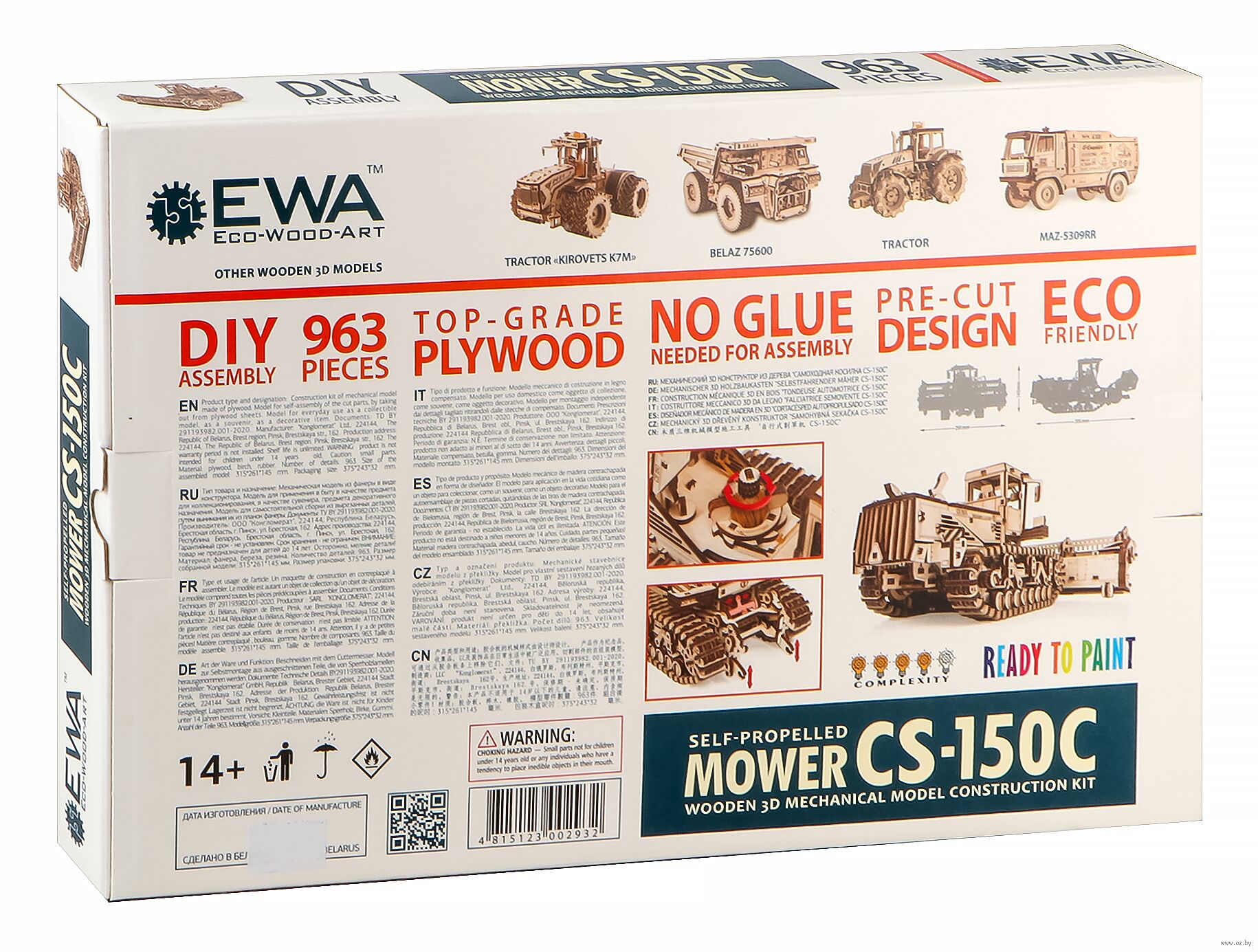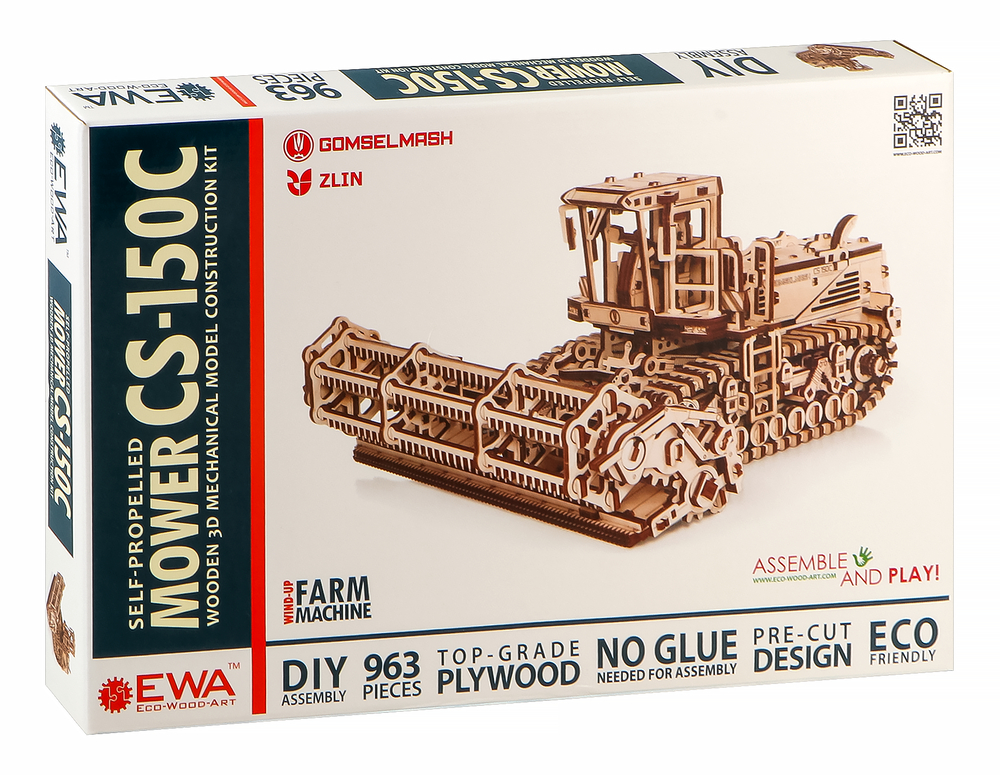 Сборная модель из дерева "Косилки самоходной", еще ее можно назвать "Комбайн". Модель механическая с заводным мотором на гусеницах, которая может двигаться по полу. Деревянный конструктор для сборки изготовлен в сотрудничестве с белорусскими машиностроительными заводами "Гомсельмаш" и "Злин".