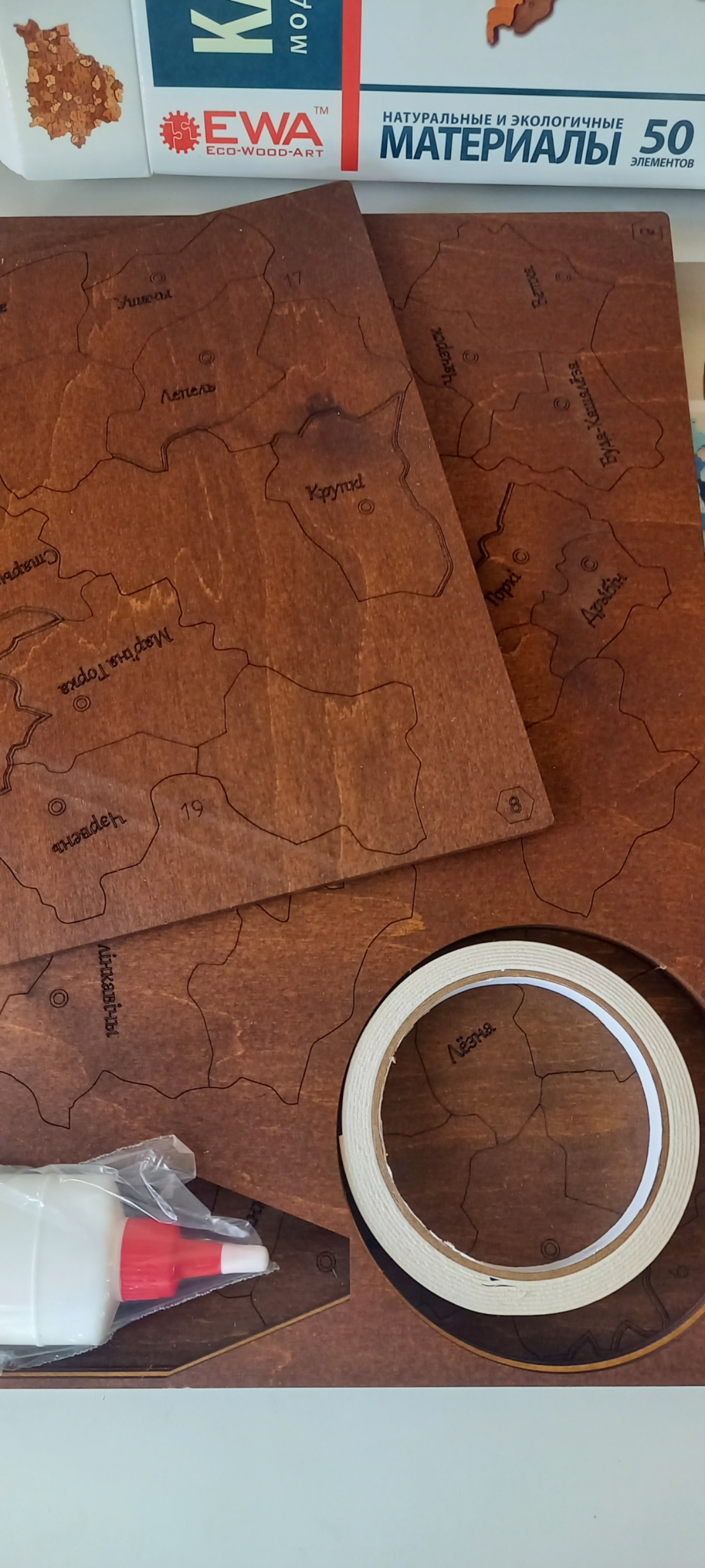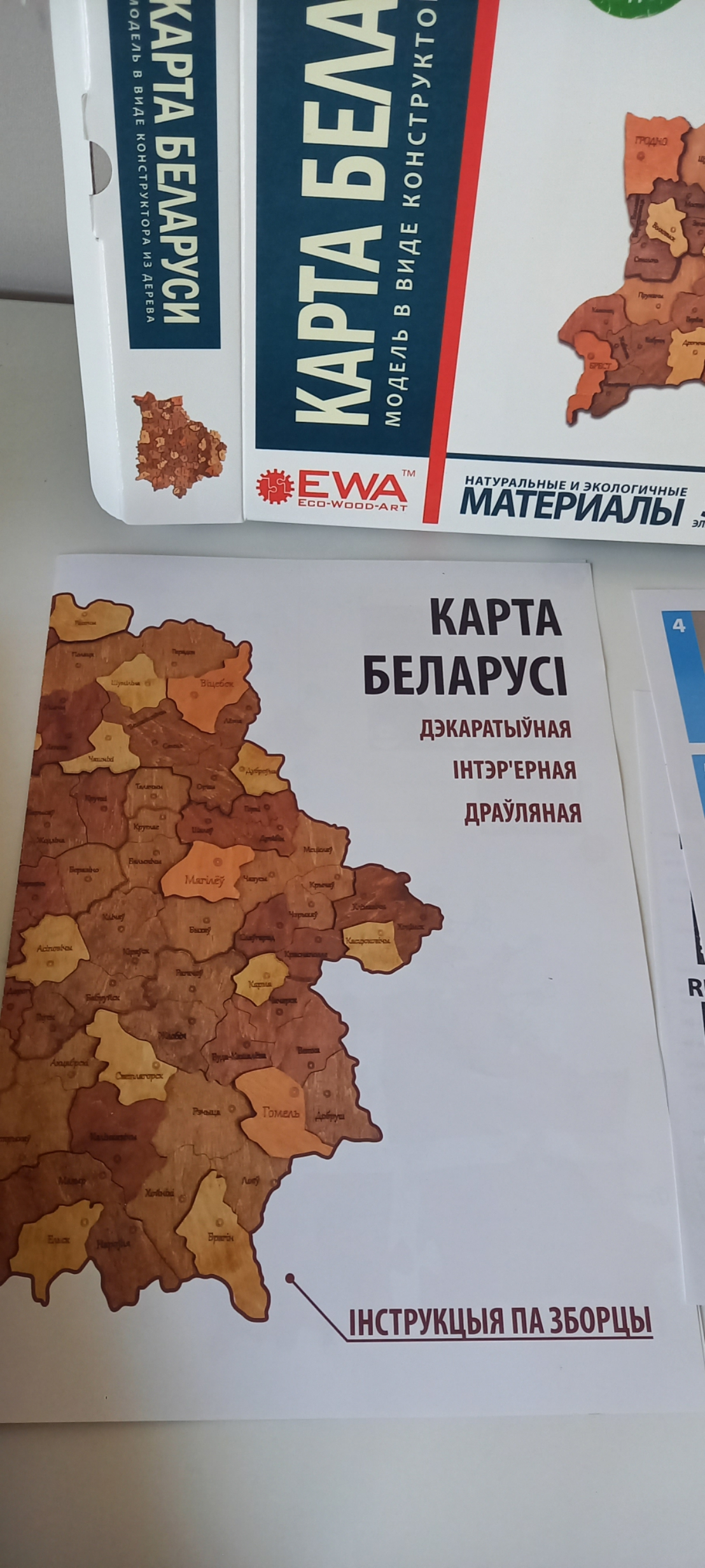 У камплекце інструкцыя па зборцы, клей і двухбаковы скотч для мацавання на сцяну.