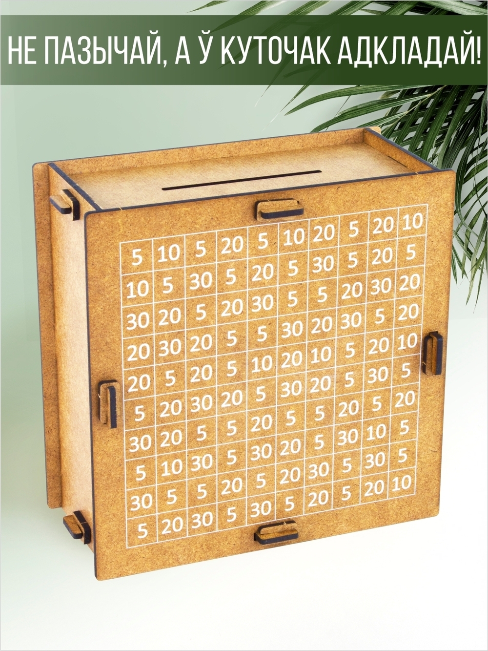 На обратной стороне копилки 100 цифр, равных денежным купюрам и наклейки в наборе.