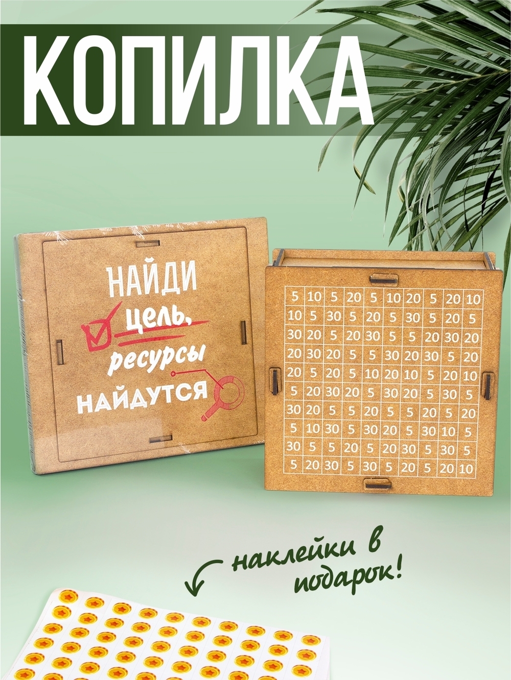 Копилка собирается из деревянных деталей, она может разбираться, но делать это часто не очень комфортно, поэтому деньги будут быстрее накапливаться. Набор наклеек добавляет азарта в игре, но можно зачёркивать цифры простым карандашом, который легко стереть при повторном использовании. Такая очень наглядная система сбережений воспринимается как игра с самим собой. А можно соревноваться парой, с братом, сестрой, чтобы было ещё азартнее. Кто быстрее? Такая копилка понравится взрослым и будет очень полезна и интересна для детей. Детям будет любопытно, сколько же осталось до мечты? И этот факт будет стимулировать их считать цифры в клетках, придумывать удобные способы счёта.