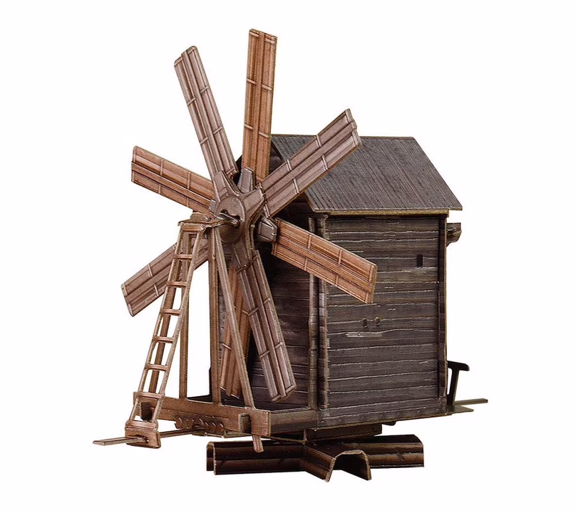 Ветряная мельница, одна из последних сохранившихся в Карелии, была построена крестьянином Биканиным в конце тридцатых годов ХХ века. Этот тип ветряной мельницы – "столбовка" – был в прошлом широко распространён по всему Заонежью. Мельница была перевезена в Кижи с соседнего Волкострова во время создания музея-заповедника и стала одним из самых романтичных экспонатов в собрании хозяйственных построек.