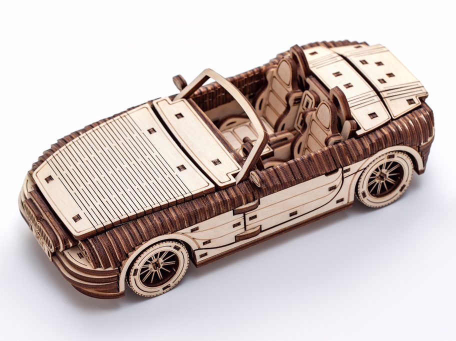 Сборная модель из дерева представляет собой кабриолет с большой детализацией, у которого открываются двери, капот и багажник, а так же крутятся колеса. А, чтобы играть с детьми было еще веселее вы можете раскрасить модель в любимые цвета.