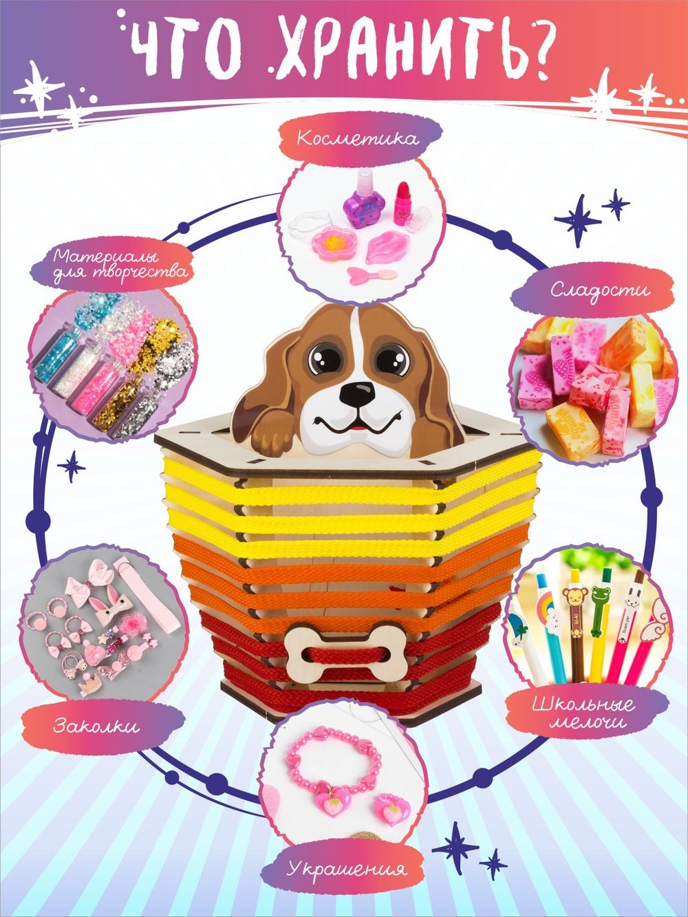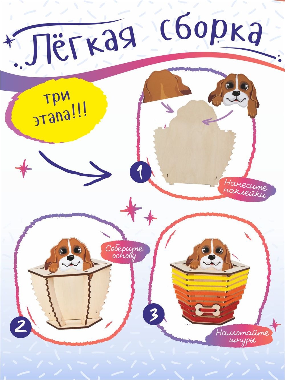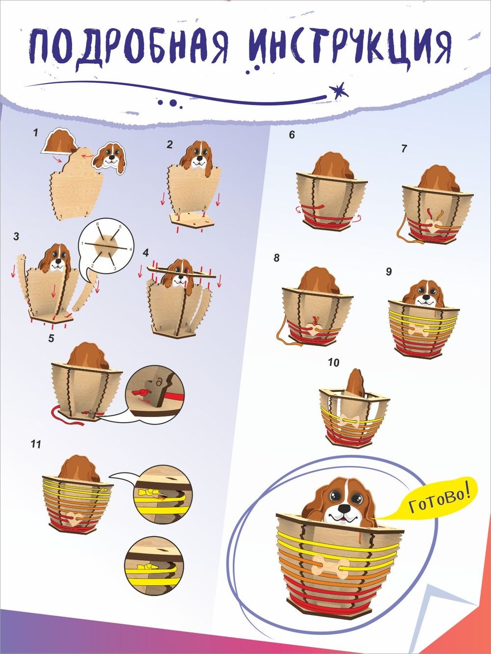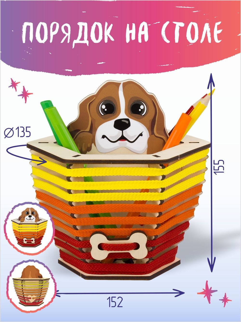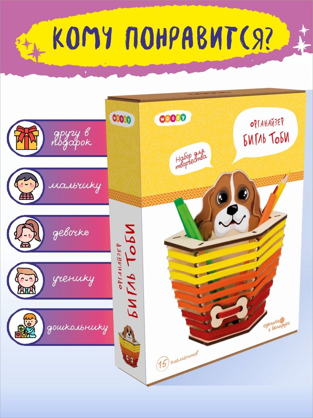 Сборная деревянная модель "Бигль Тоби" станет функциональным и ярким дополнением письменного стола, вместит в себя канцелярские принадлежности, небольшие учебные карточки и любимые конфеты.