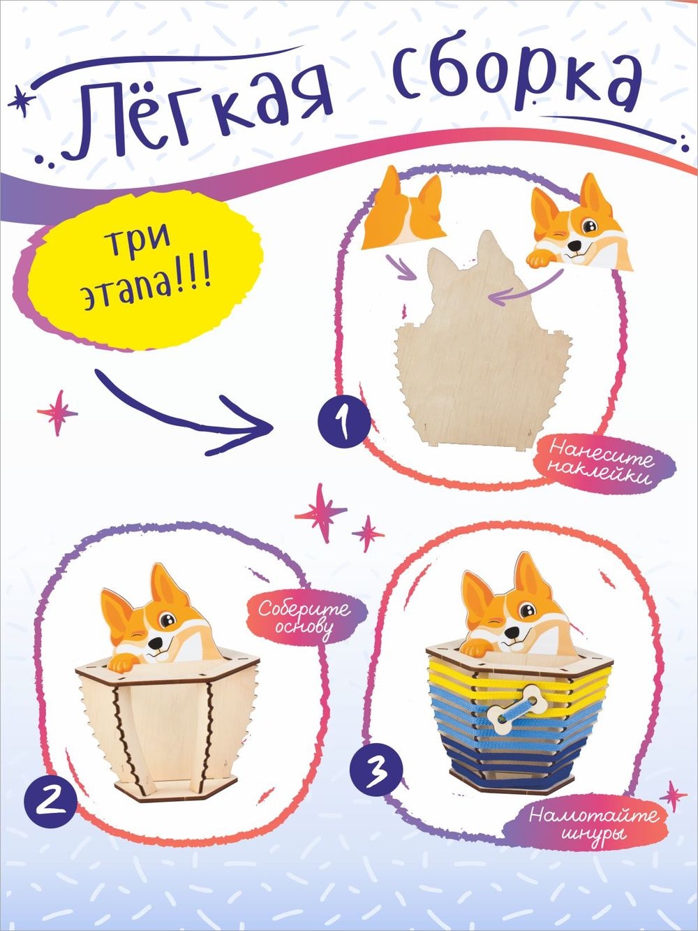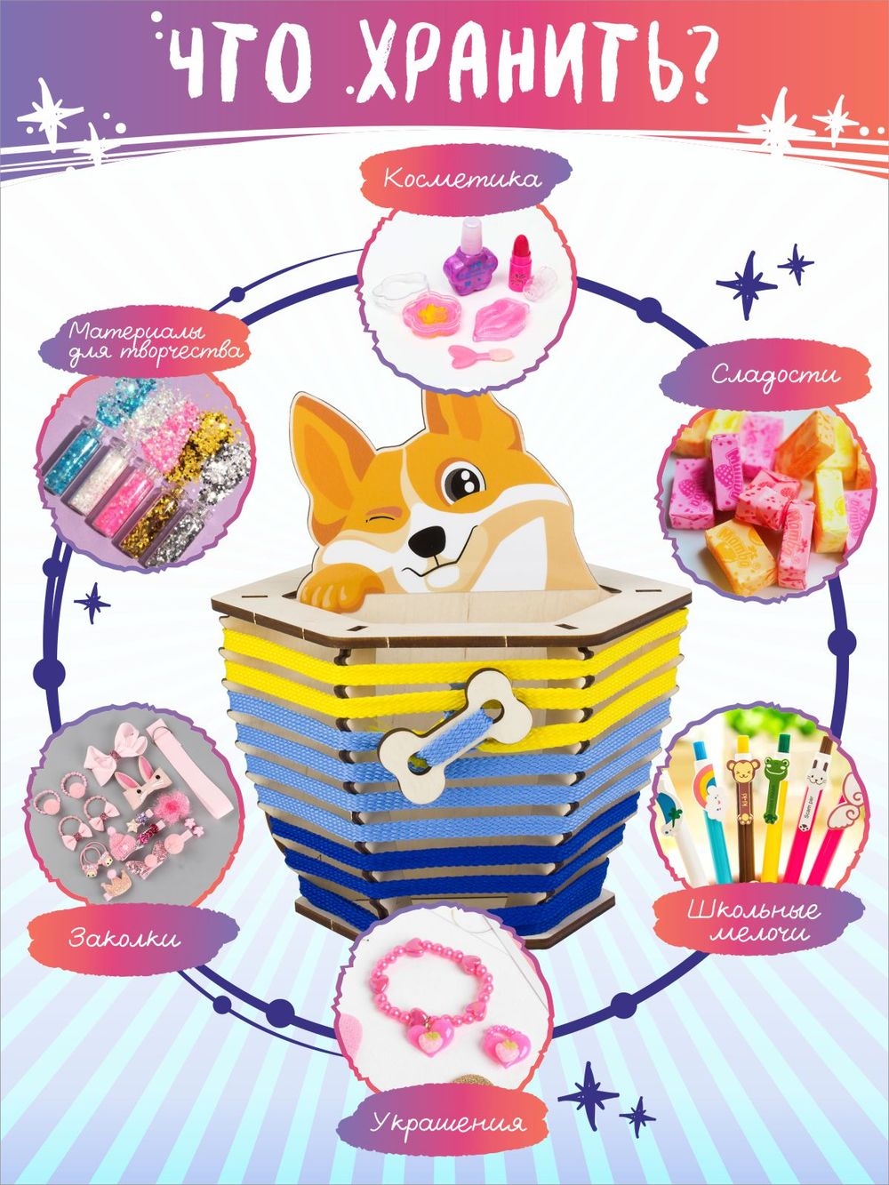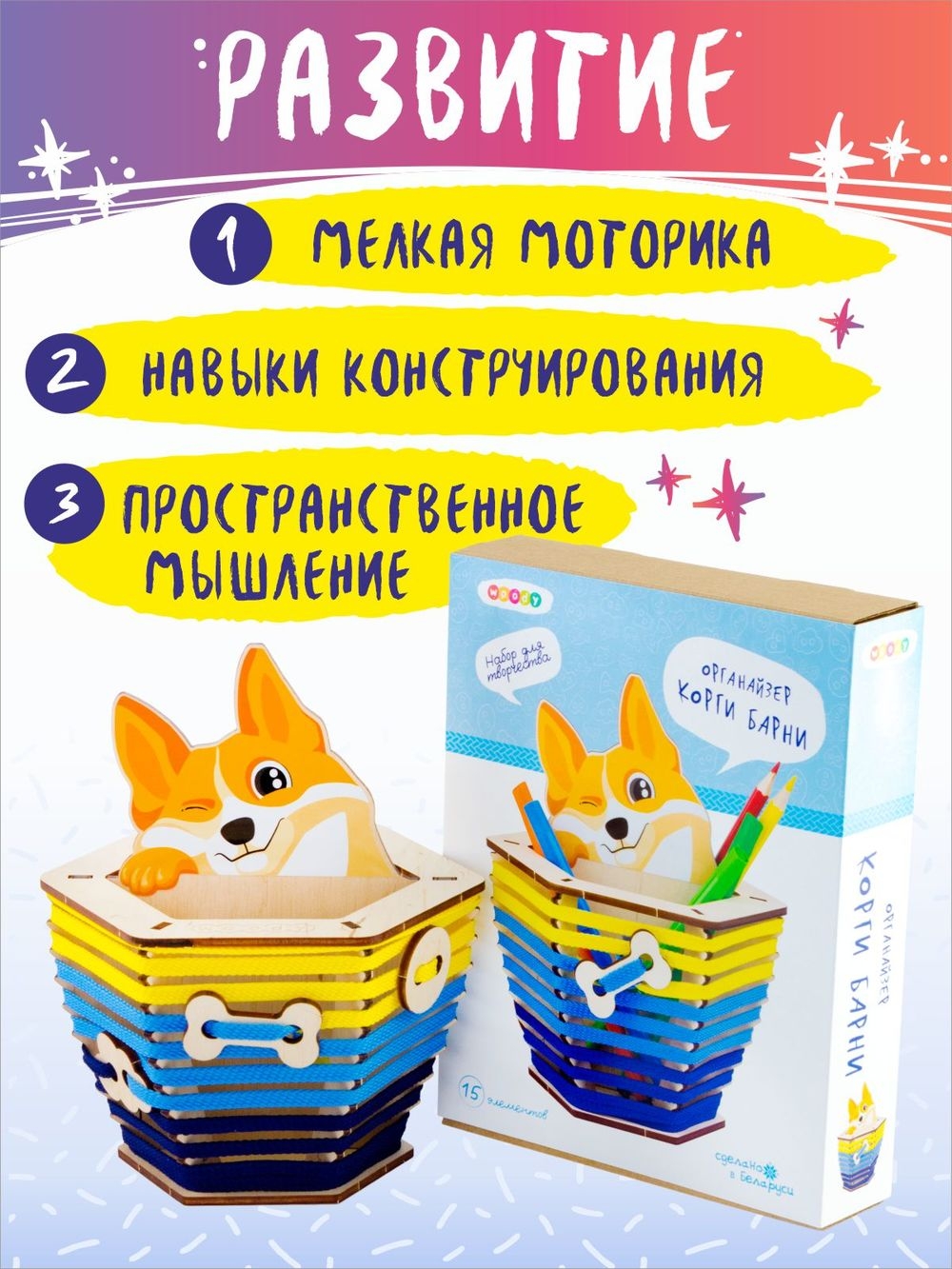 Собери сборную деревянную модель "Корги Барни" и получи удобное и вместительное хранилище для важных вещей: маленьких учебных карточек, канцелярских принадлежностей и даже вкусных конфет.