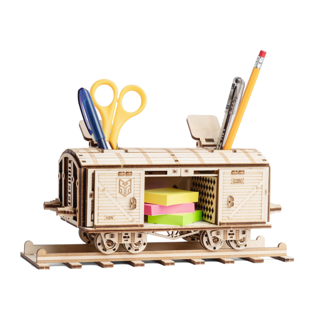 Деревянный конструктор "Товарный вагон" – это и удобный органайзер под канцелярские товары и стильное украшение для интерьера дома или офиса. Поэтому органайзер из фанеры станет удачным подарком для детей-школьников, учителей, офисных работников.