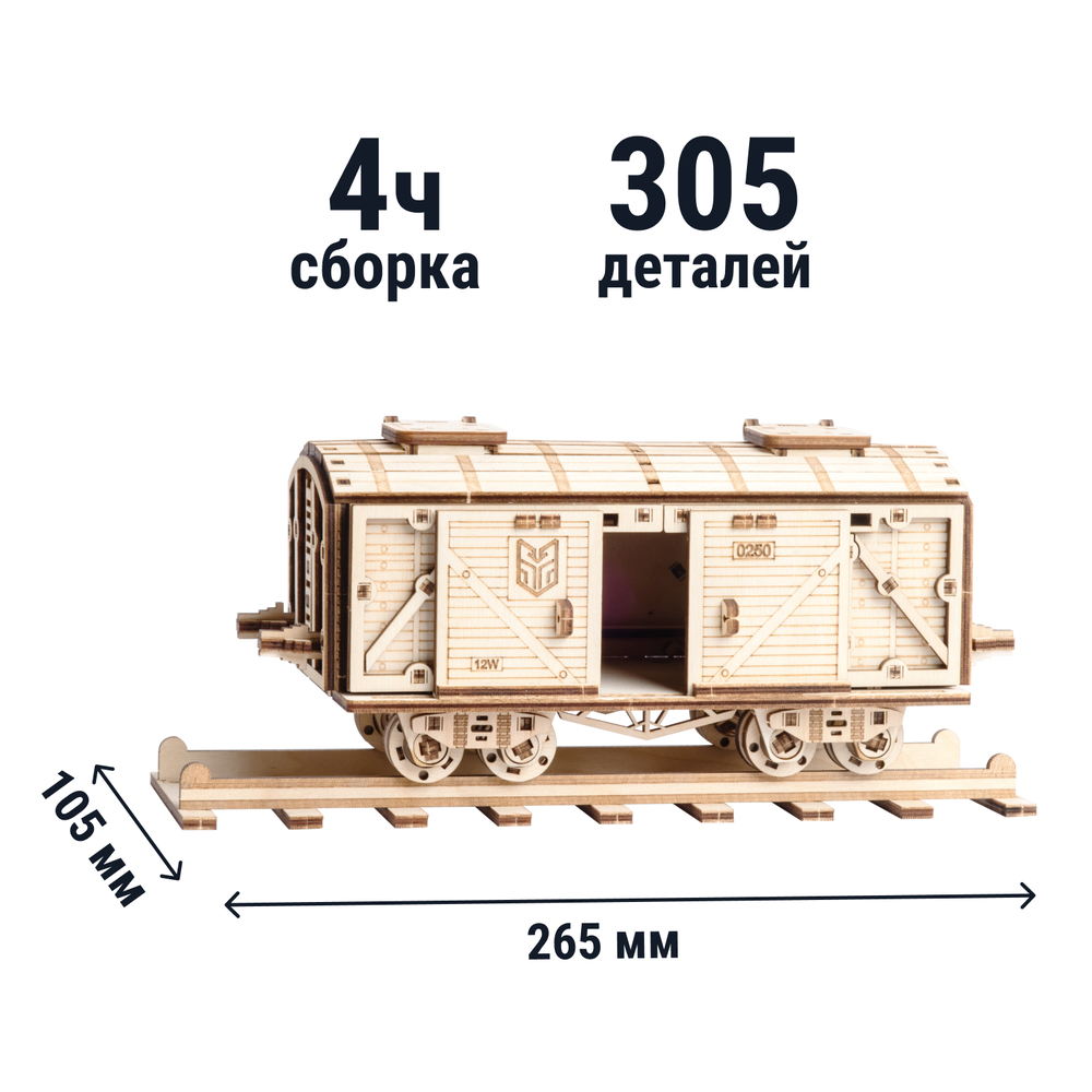"Товарный вагон" изготовлен из высококачественной эко-фанеры, что гарантирует его отличный внешний вид и долговечность. Легко собирается без использования клея, в готовом виде имеет длину 265 см.