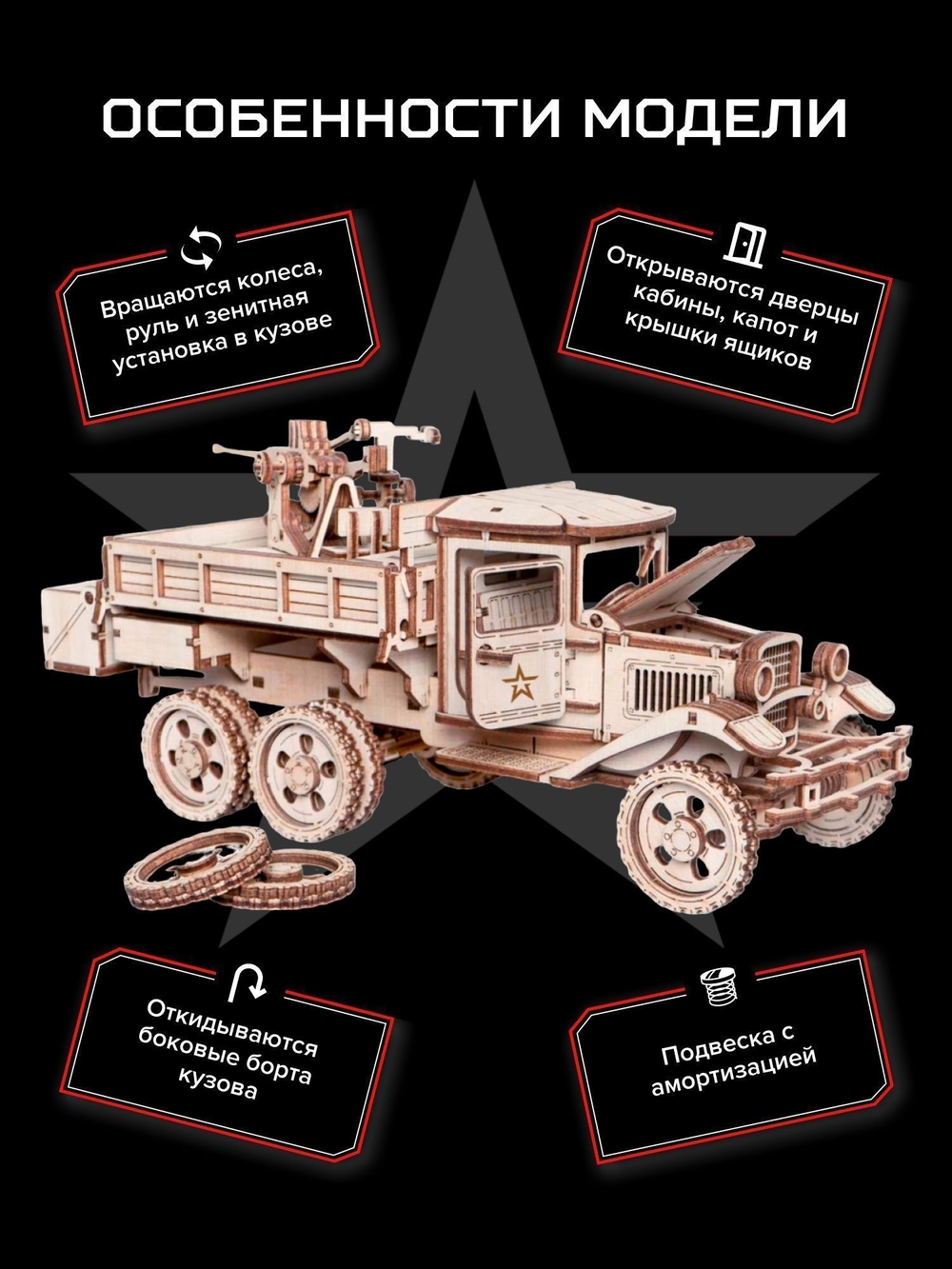 У собранной модели из дерева вращаются колеса, руль и зенитная установка в кузове, открываются дверцы кабины, капот и крышки ящиков, откидываются боковые борта кузова. Имеется подвеска с амортизацией, которая позволит ездить по полу и неровностям. При желании игрушку можно раскрасить акриловыми красками. Автомобиль порадует вас своей детализацией!