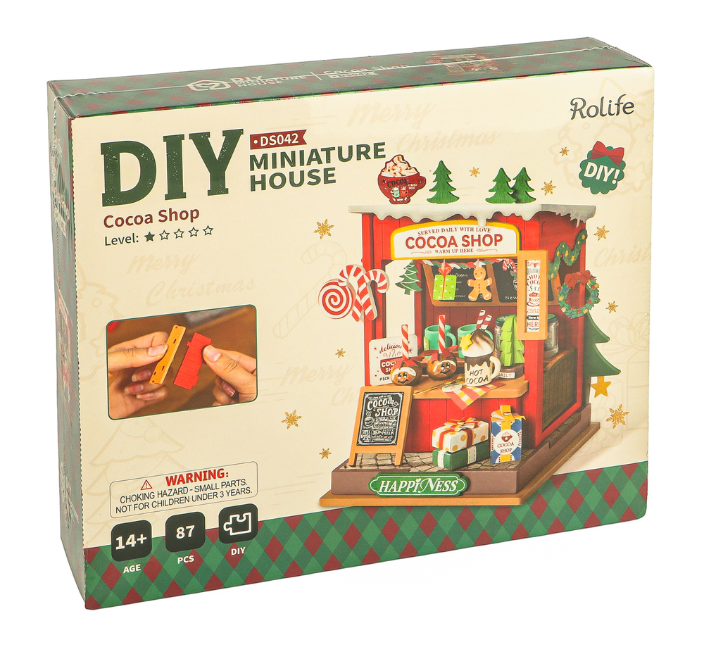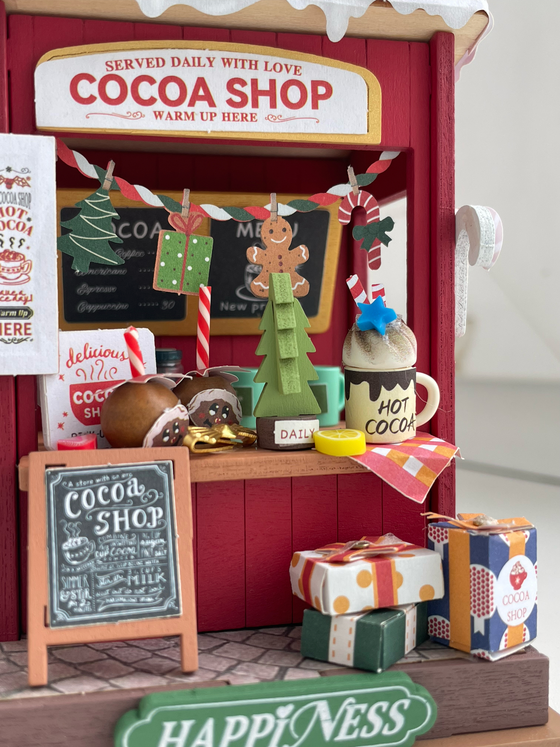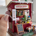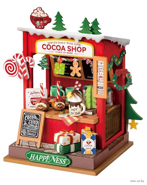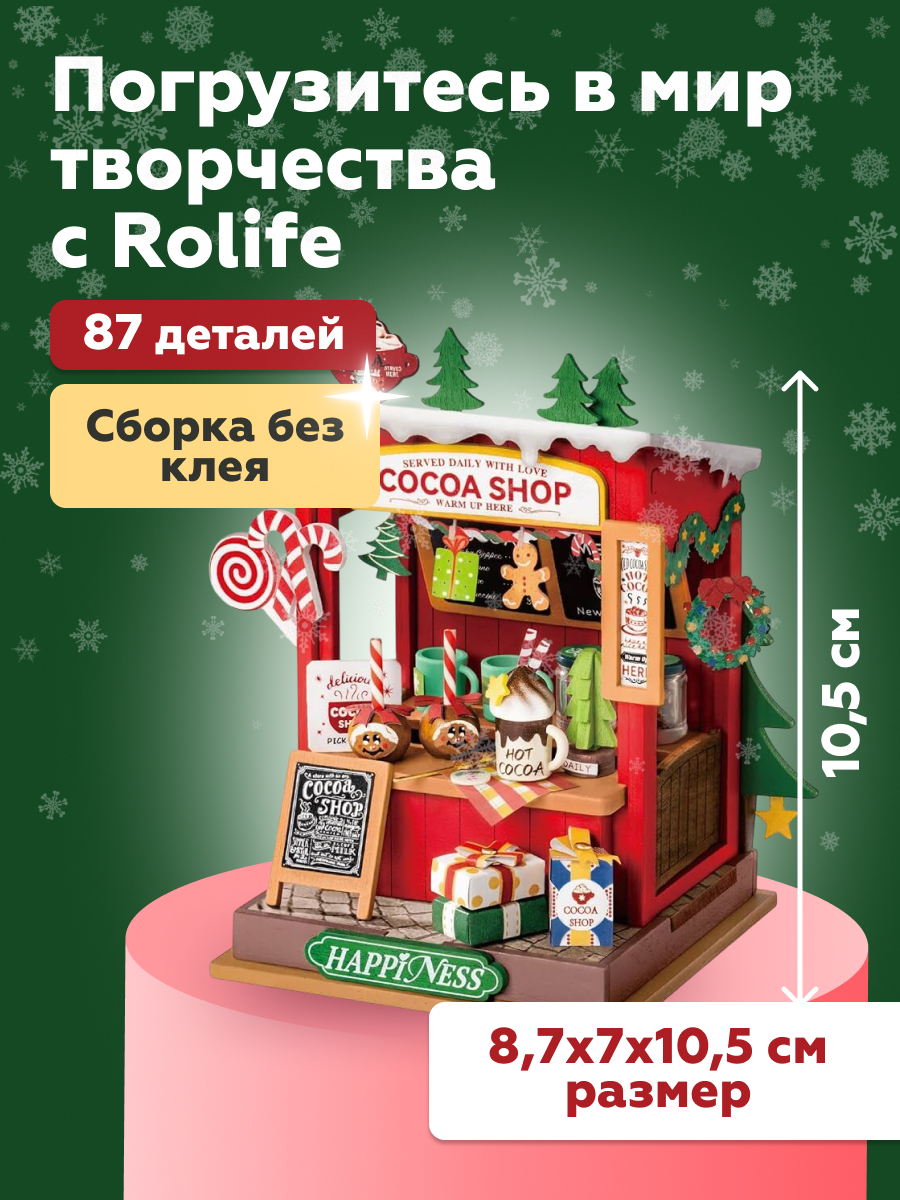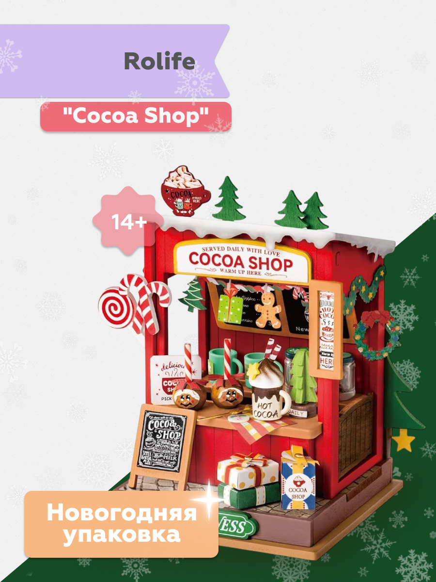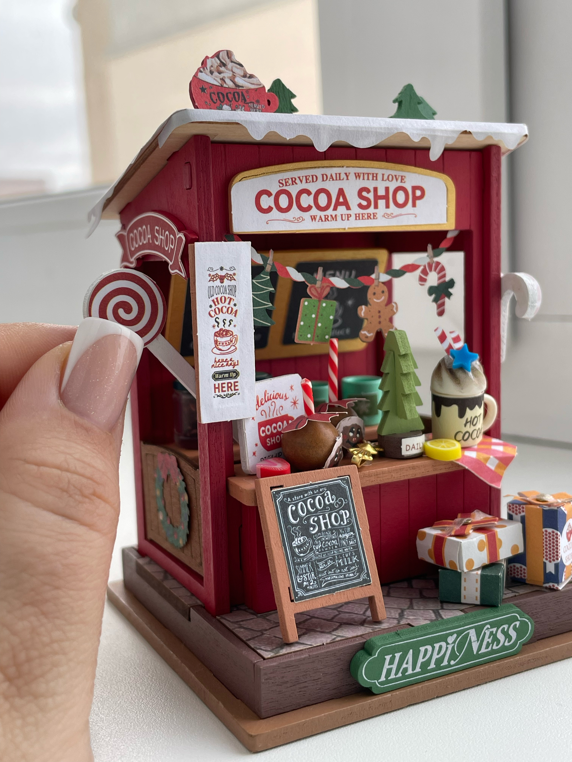 В лавочке "Какао-шоп" праздники теплые и сладкие. Этот миниатюрный домик, сделанный своими руками представляет собой новогодний стенд с горячим какао, который прогонит холод в этот снежный день.