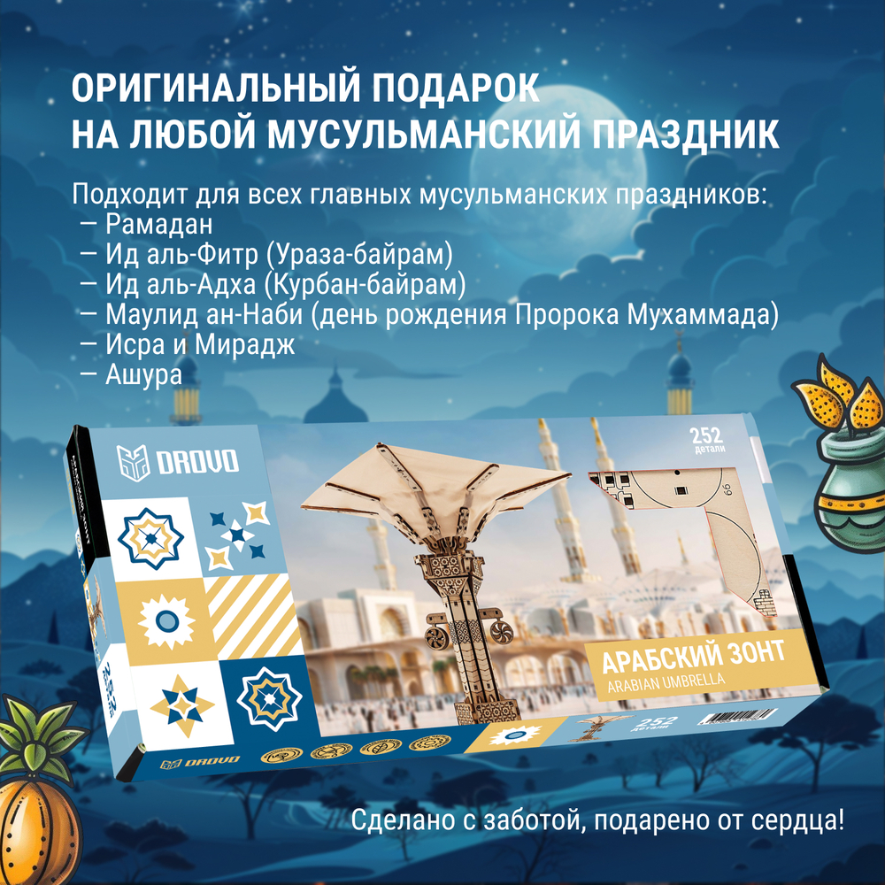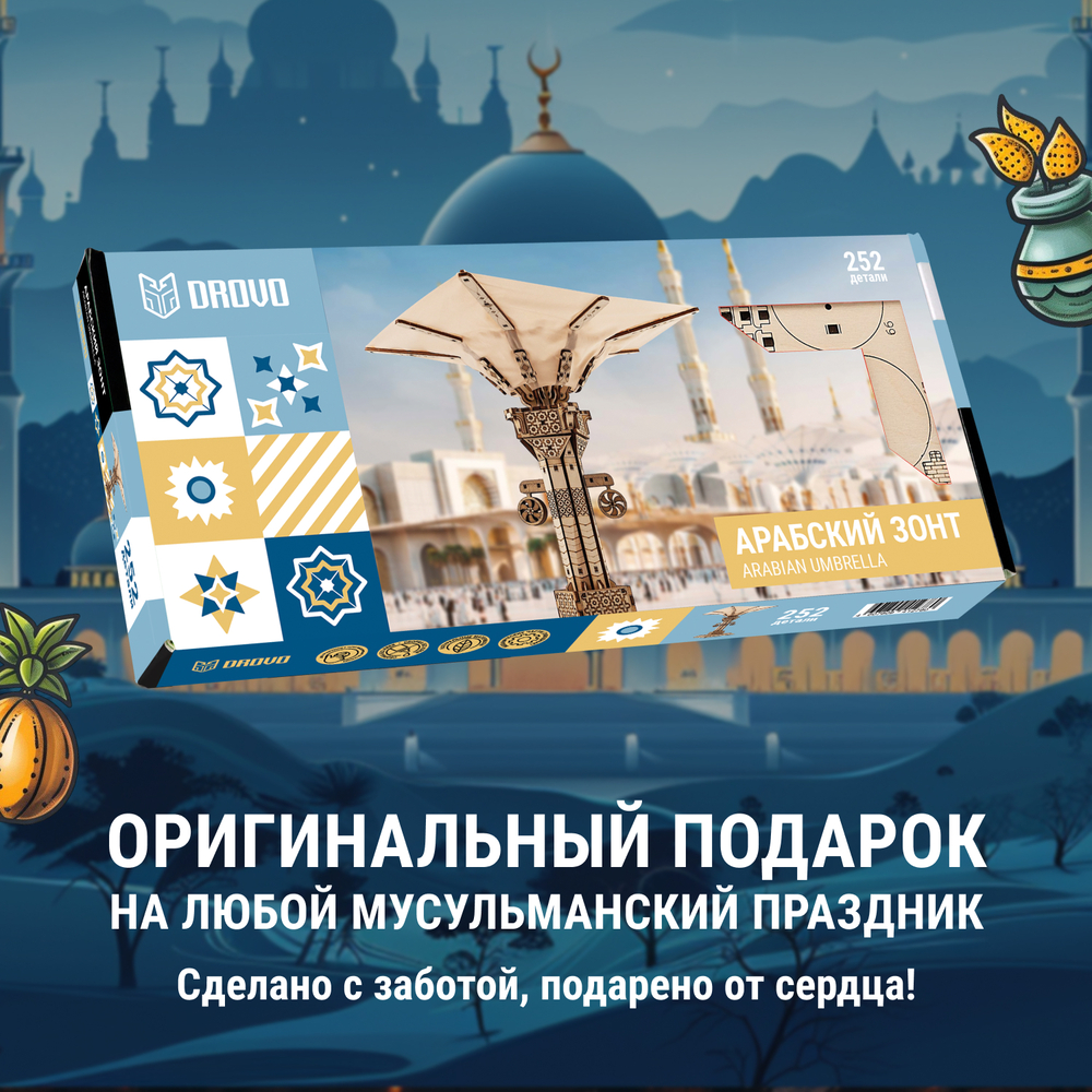 Механический деревянный конструктор DROVO "Арабский Зонт" – это прекрасный подарок для ребенка и взрослого, который увлекается архитектурой и необычными конструкциями.