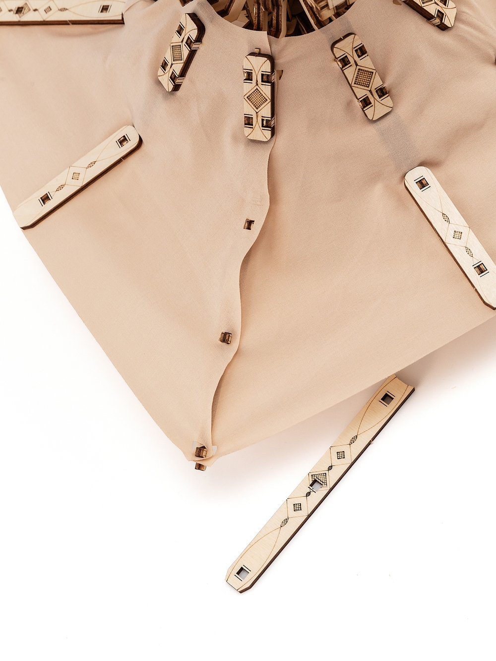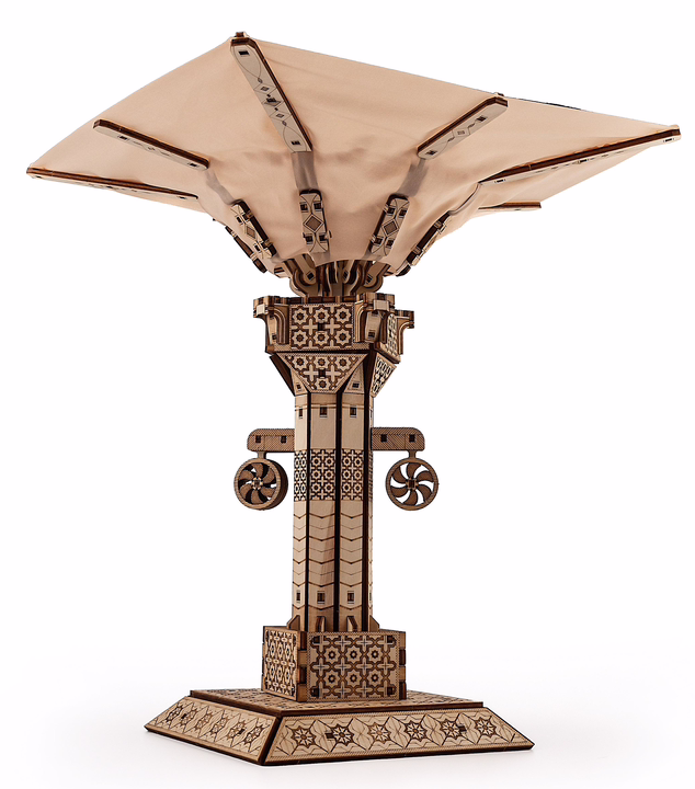 Сборная модель из дерева оснащена механизмом и отличается высокой детализацией, вдохновленной традиционными арабскими архитектурными мотивами. Модель создана на основе известных конструкций для защиты от солнца на площади у Мечети Пророка в Медине, Саудовская Аравия. Это один из самых необычных механизмов, который днем защищает от солнца, а ночью освещает площадь с уникальной складной конструкцией.