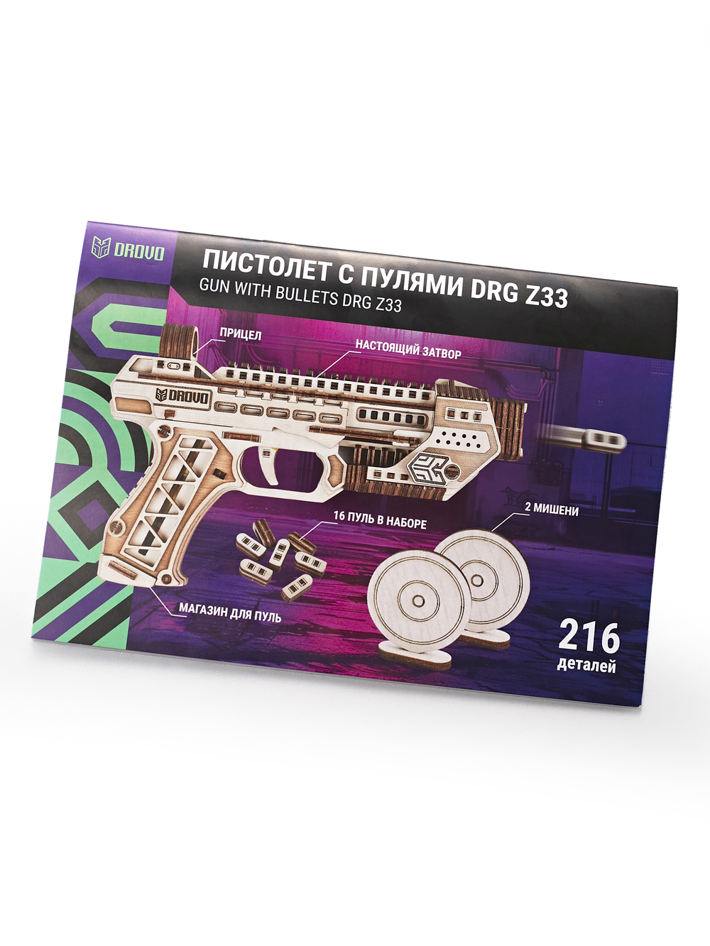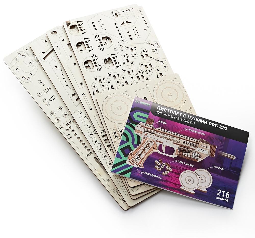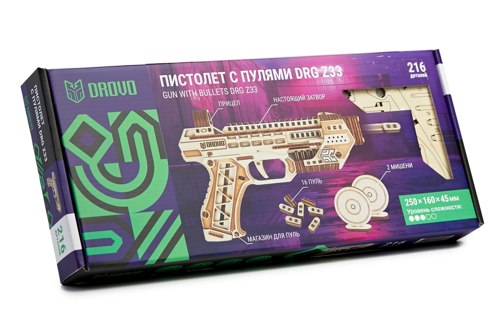 В комплект с конструктором входят мишени для стрельбы, что позволяет сразу после сборки приступить к увлекательной игре. Это делает сборную модель DROVO "Пистолет с пулями" DRG Z33 не только интересным проектом для самостоятельной сборки, но и полноценным игровым набором.