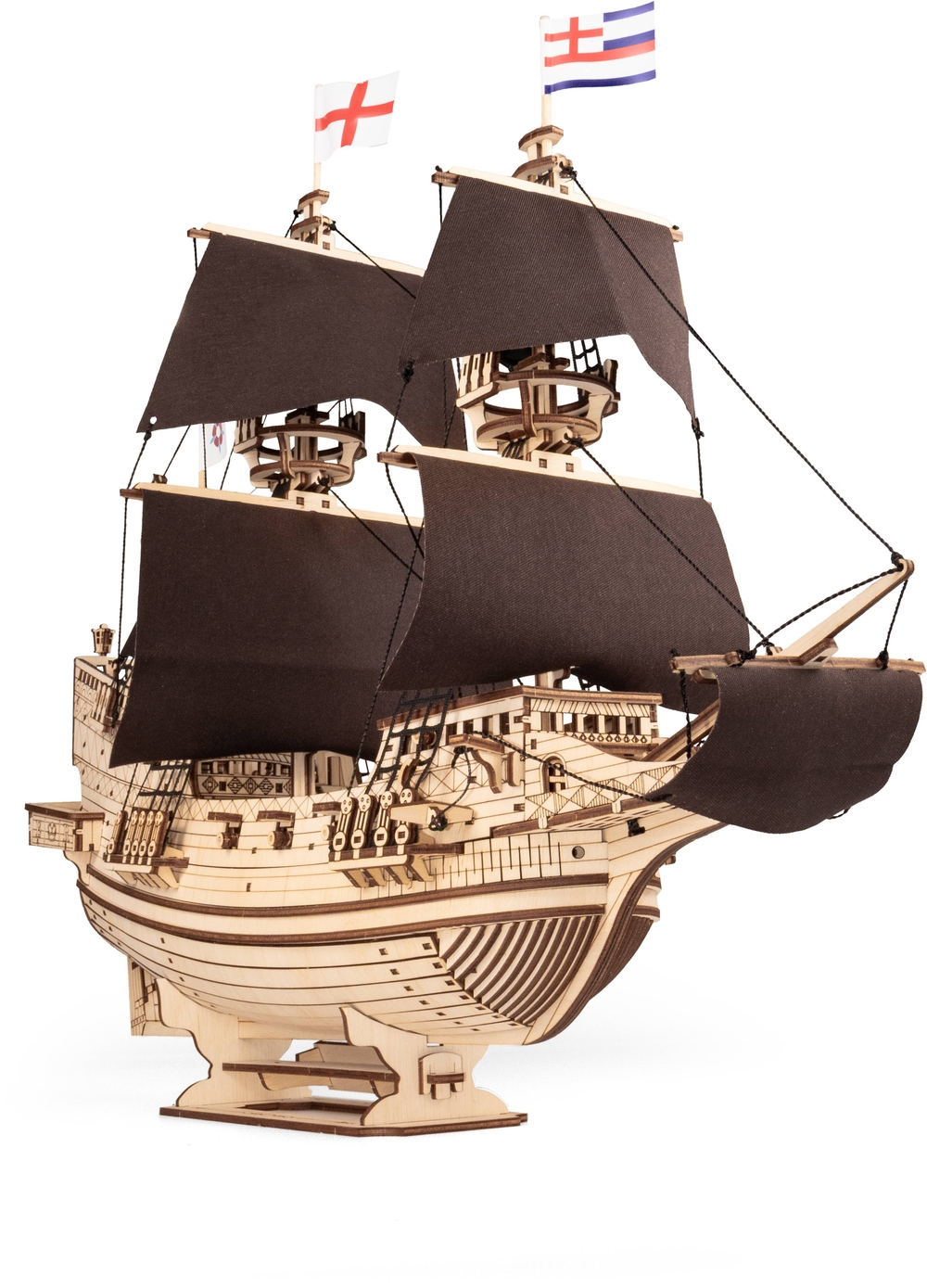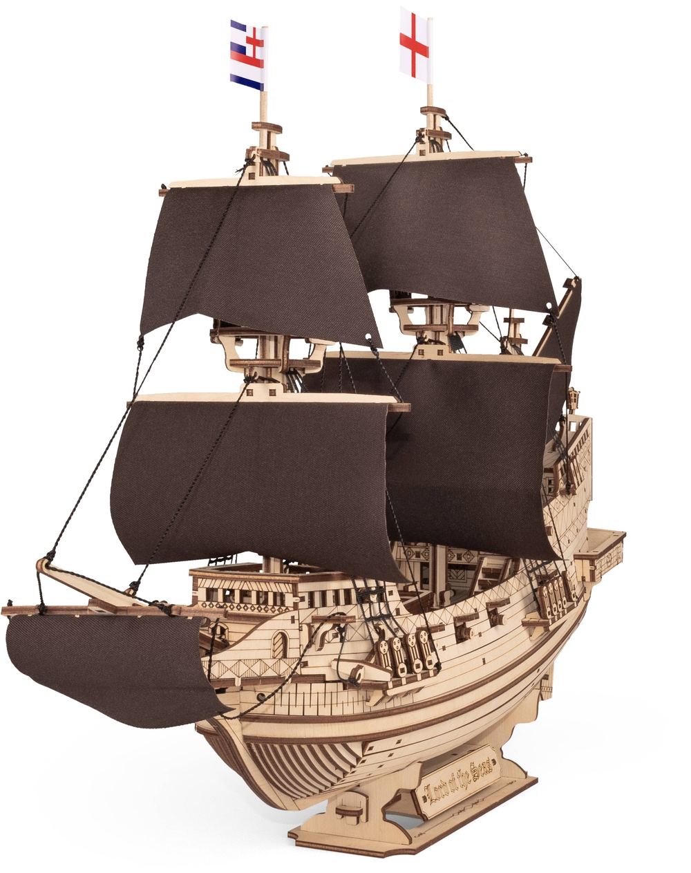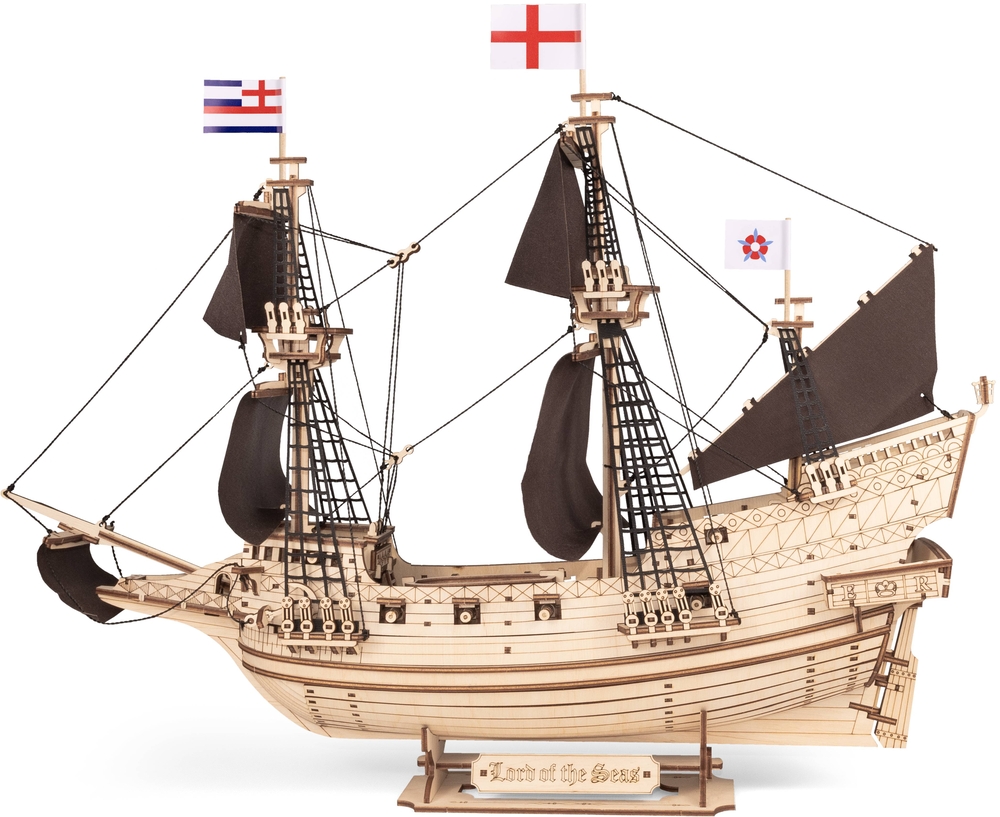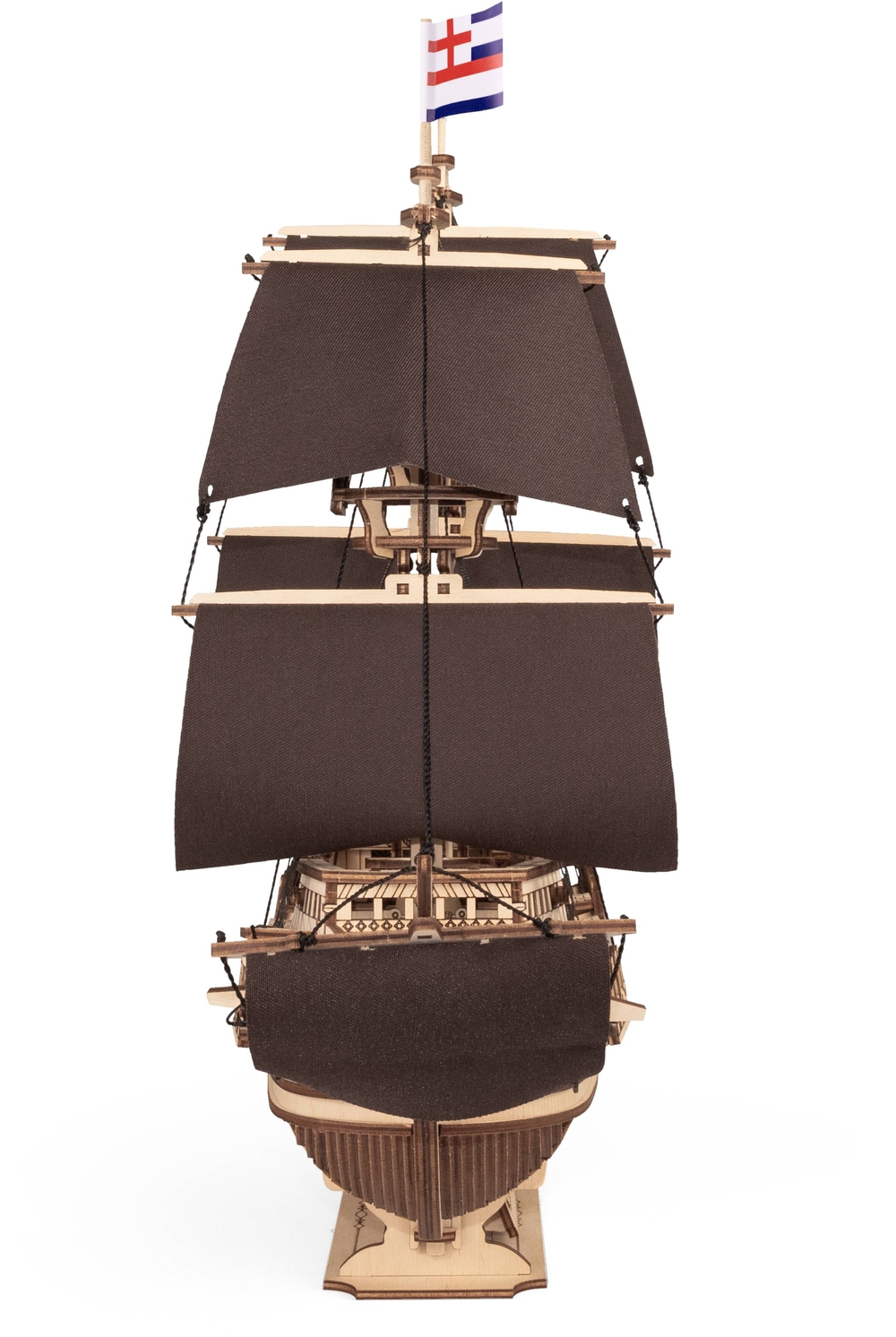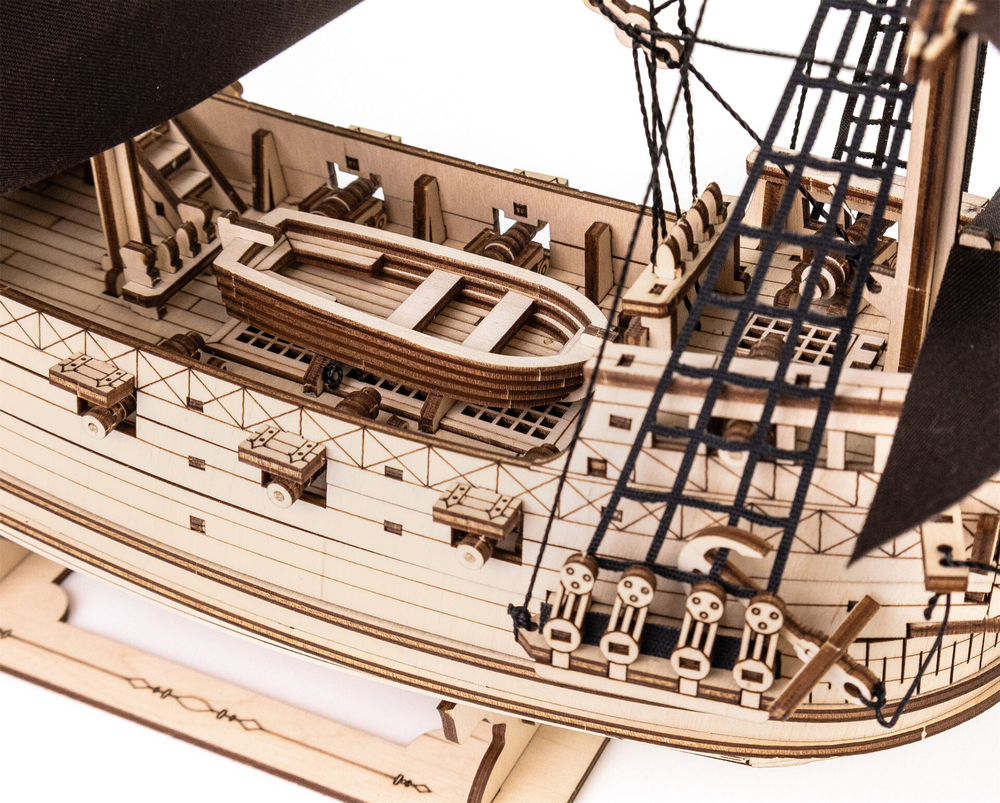 Модель изготовлена из качественного дерева и включает в себя все необходимые элементы для сборки. В комплект входит набор стильных коричневых парусов, которые придают кораблю реалистичный вид.