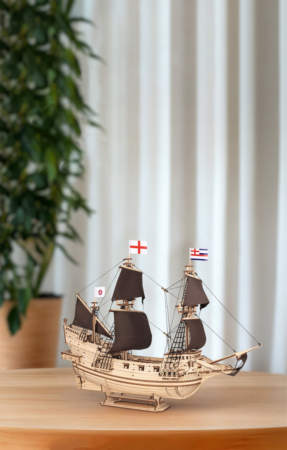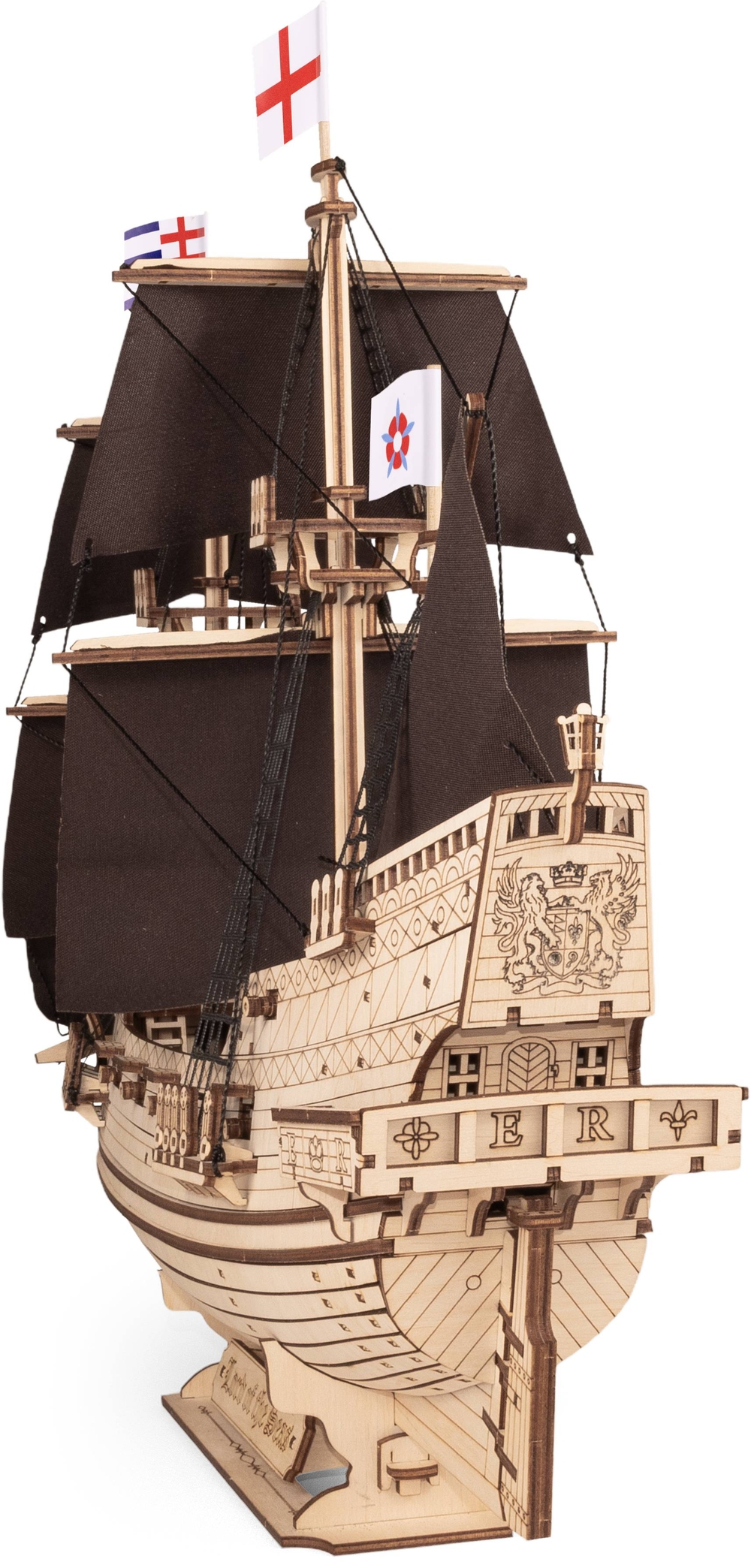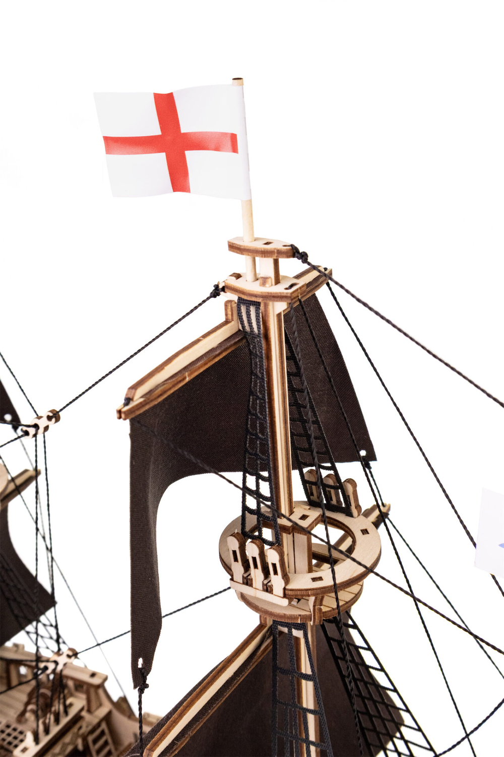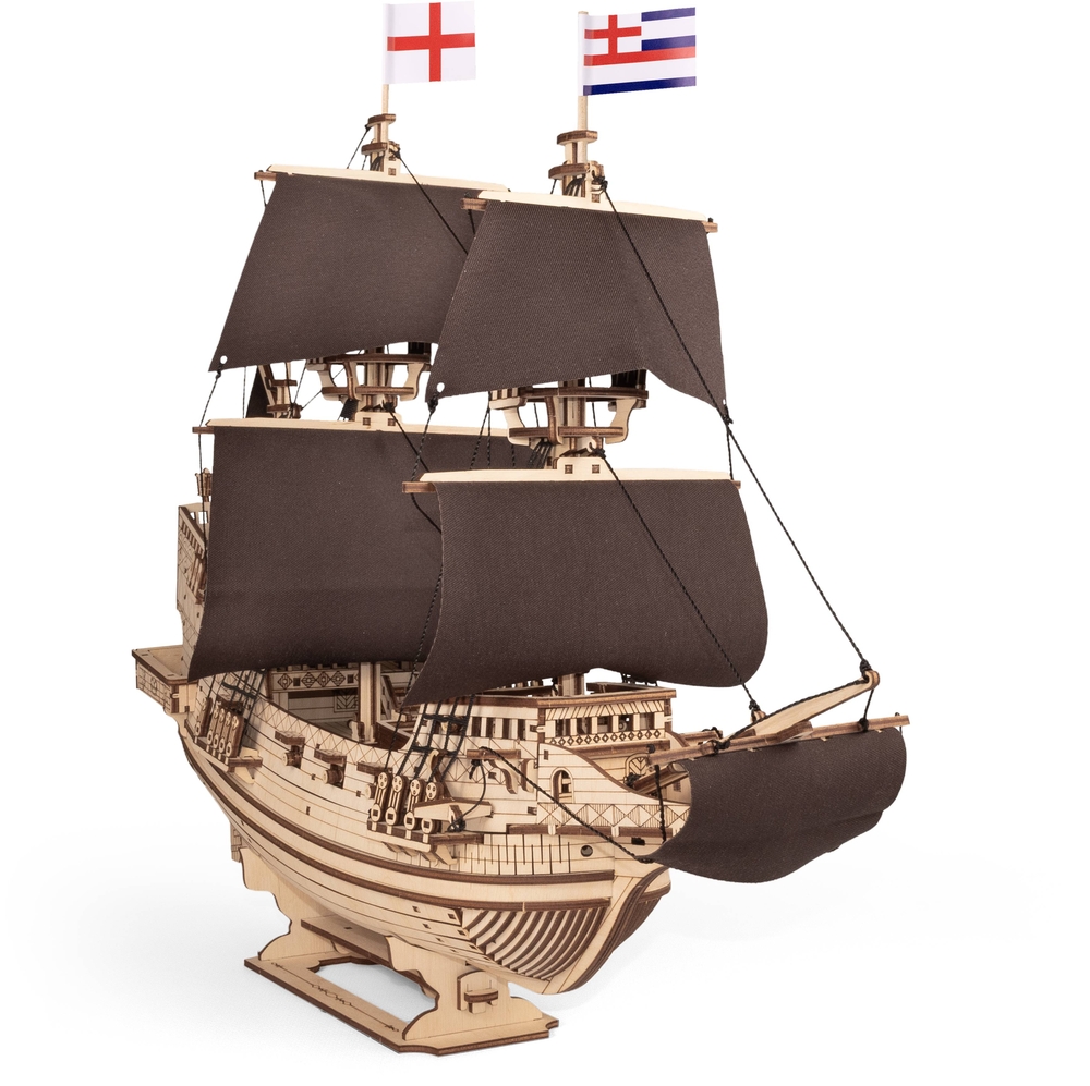 Модель изготовлена из качественного дерева и включает в себя все необходимые элементы для сборки. В комплект входит набор стильных коричневых парусов, которые придают кораблю реалистичный вид.