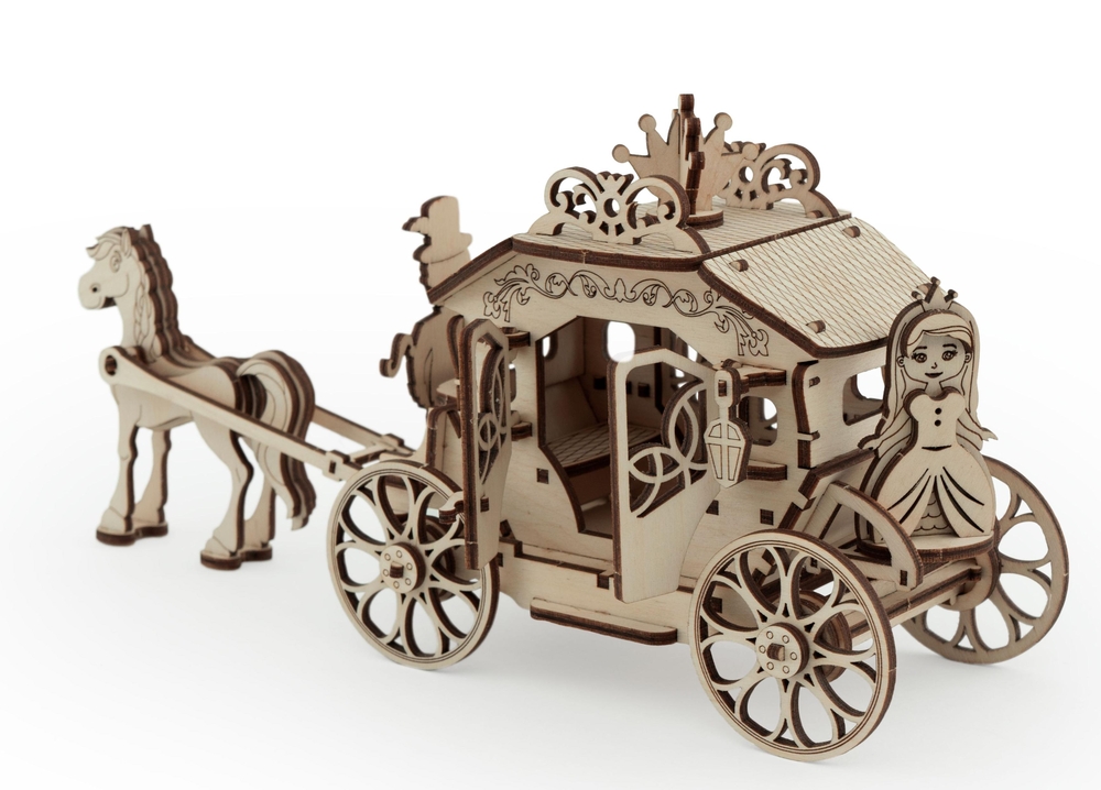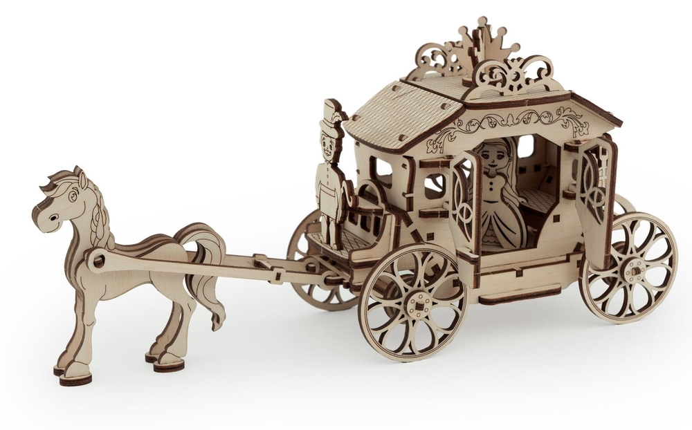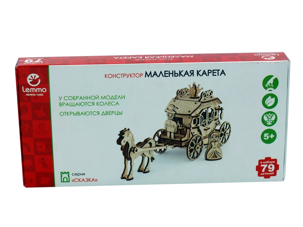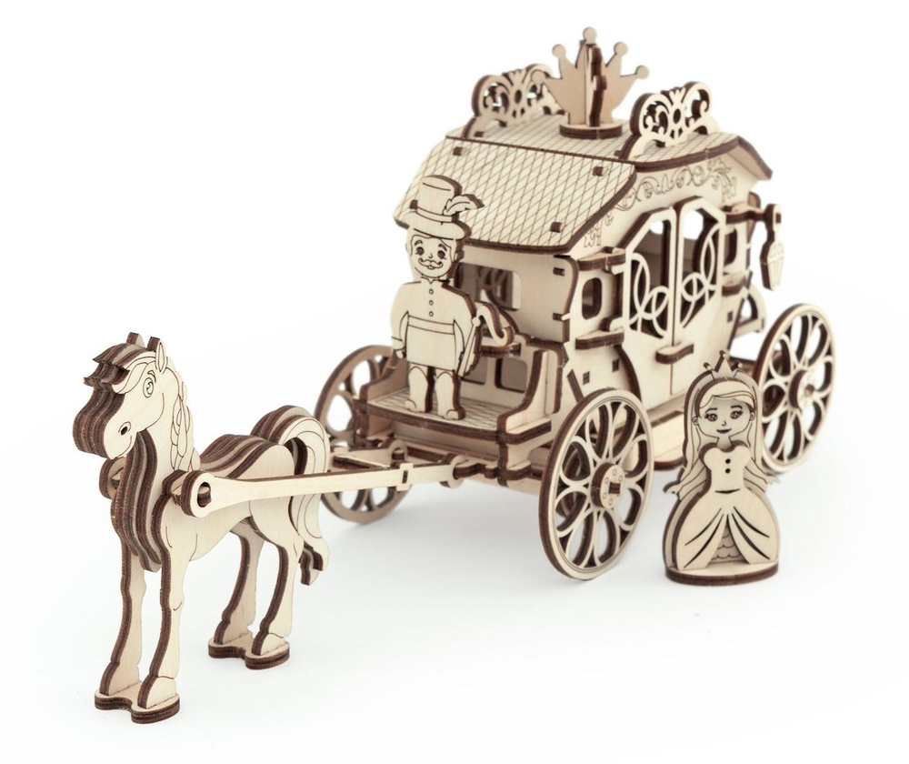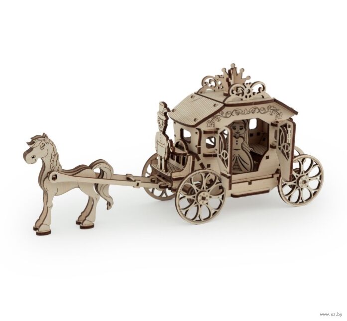 В набор входит фигурка лошади, кучера и принцессы. У собранной деревянной кареты вращаются колеса, открываются дверцы кареты.