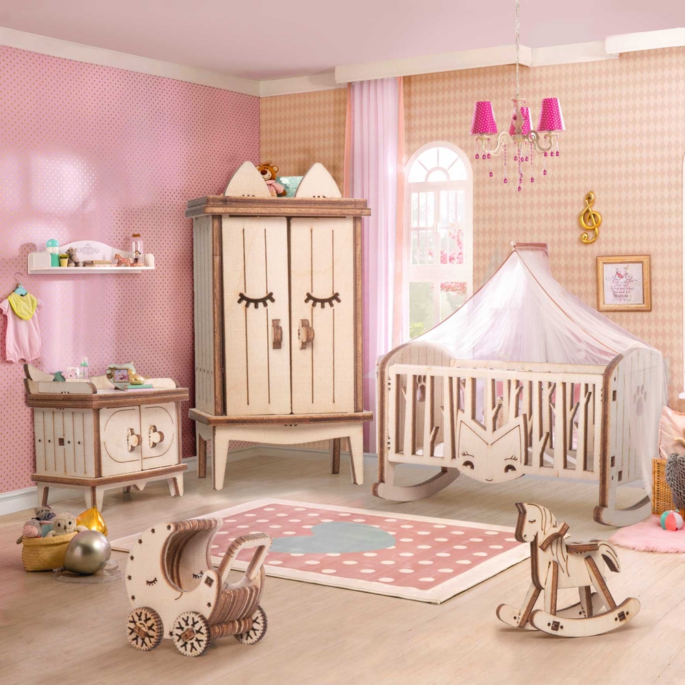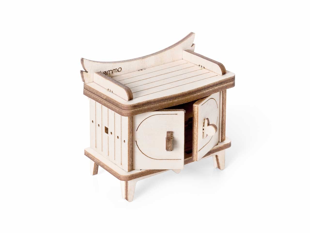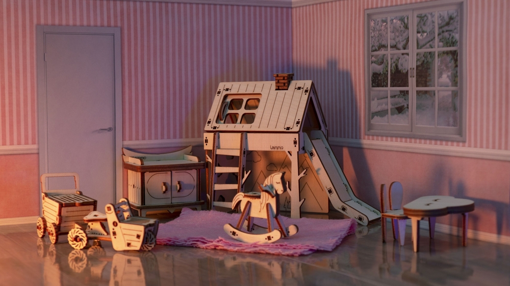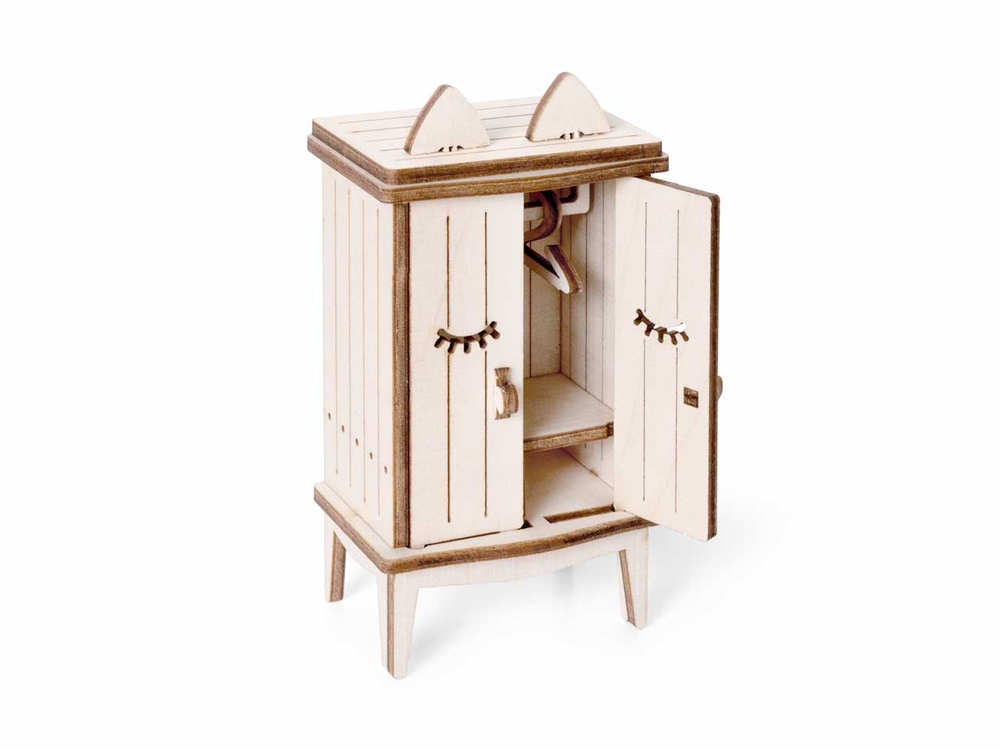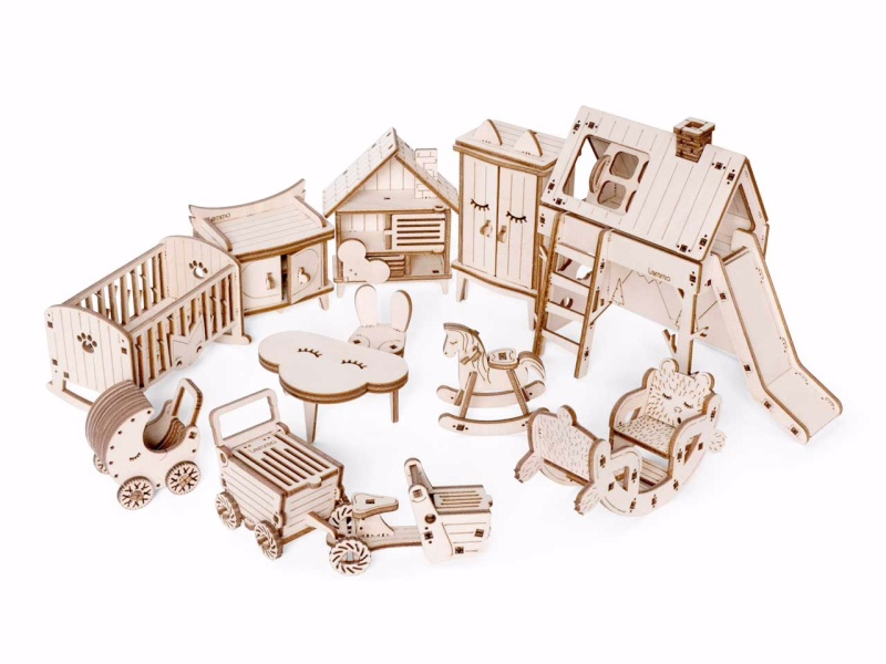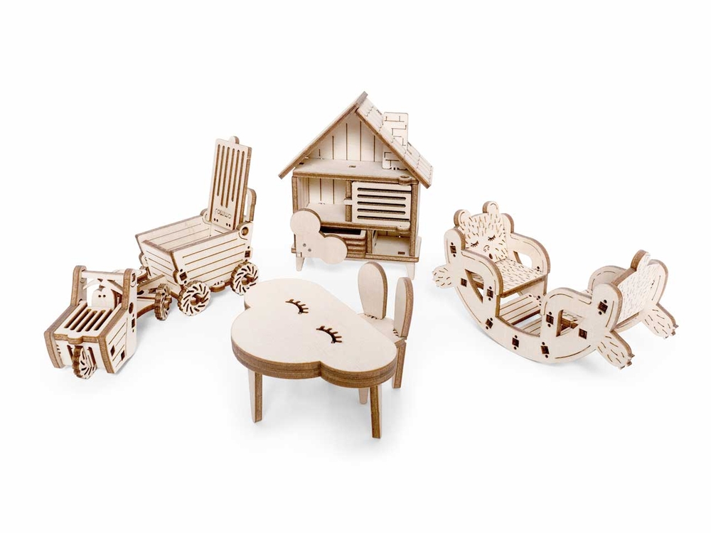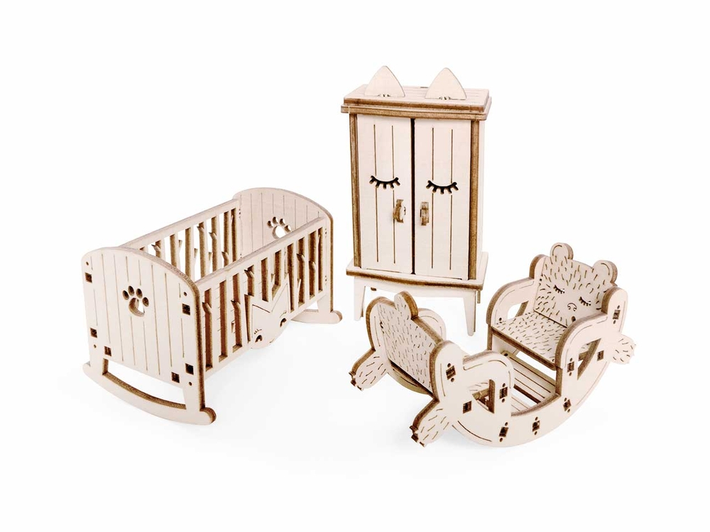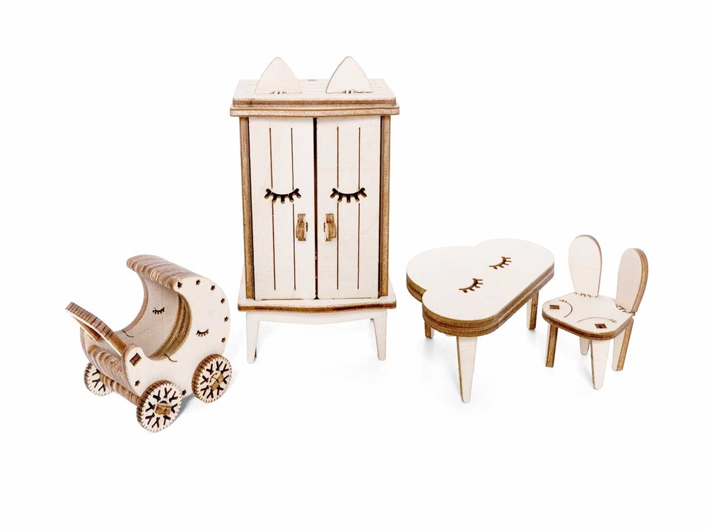Открываются дверцы шкафчиков, крутятся колёса. Наборы подходят для кукольного дома "Венеция" и "Лофт". При желании мебель можно раскрасить акриловыми красками. Так же можно приобрести наборы мебели "Ванная" и "Бытовая техника".