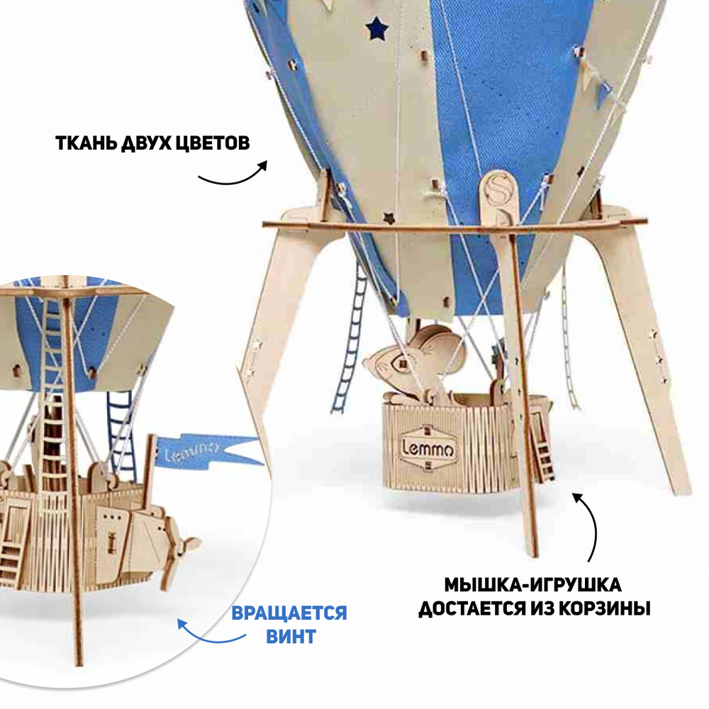 У собранного светильника ночника из корзины достается игрушка мышка. Баллон воздушного шара состоит из ткани двух цветов, а также обвязан канатной нитью. У корзины вращается винт. Модель имеет светодиодный источник