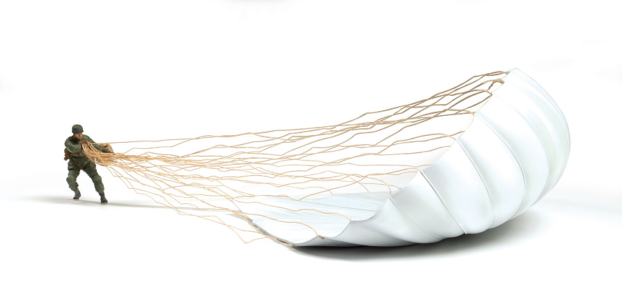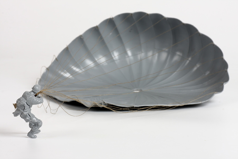 Во второй половине войны десантные войска Германии использовались в основном в качестве регулярных пехотных соединений, для поддержки наземных сил. Успешные действия немецких десантников заставили высшее руководство Союзников пересмотреть своё отношение к этому новому роду войск. Набор деталей для сборки 5 фигурок парашютистов и одного парашюта.
